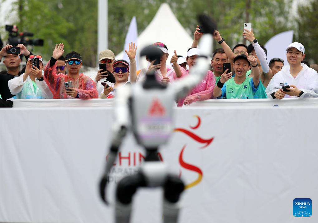 Participants waves to a robotic participant "Benben" before the Beijing E-Town half-marathon and humanoid robots half-marathon in the Beijing Economic-Technological Development Area in southeast Beijing, April 19, 2025. (Xinhua/Cao Can)