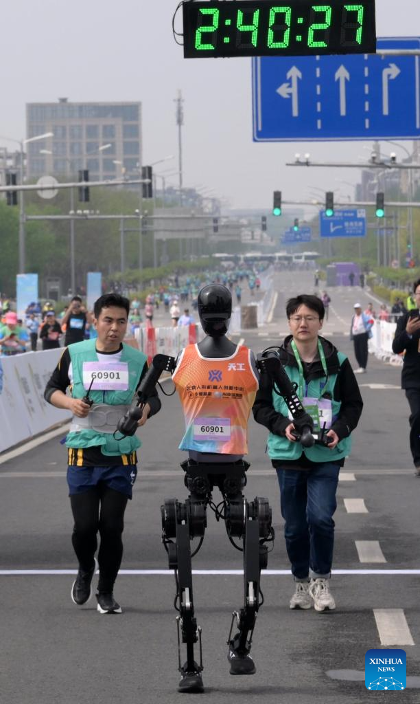 Robotic participant "Tiangong Ultra" (2nd L) crosses the finishing line as engineers run alongside during the Beijing E-Town half-marathon and humanoid robots half-marathon in the Beijing Economic-Technological Development Area in southeast Beijing, China, April 19, 2025. (Xinhua/Li He)