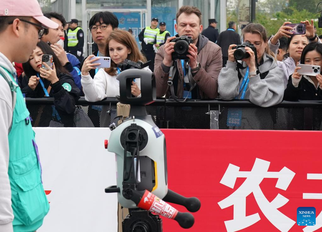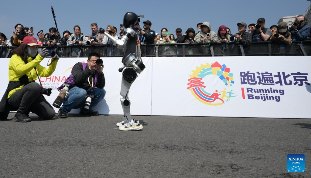Journalists take photos of a robotic participant during the Beijing E-Town half-marathon and humanoid robots half-marathon in the Beijing Economic-Technological Development Area in southeast Beijing, China, April 19, 2025. (Xinhua/Zhang Chenlin)