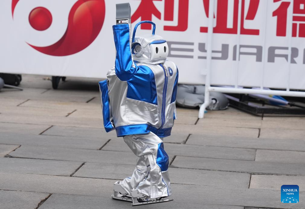 Robotic participant "Zhurixingzhe" competes during the Beijing E-Town half-marathon and humanoid robots half-marathon in the Beijing Economic-Technological Development Area in southeast Beijing, April 19, 2025. (Xinhua/Cao Can)
