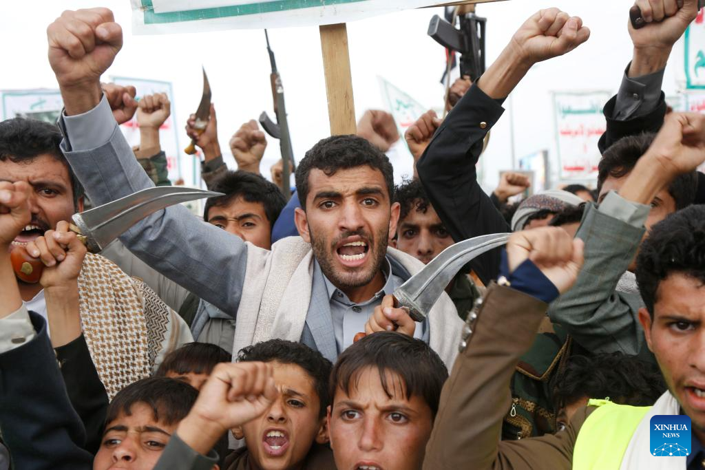 Protestors chant slogans during a protest against U.S. airstrikes on Yemeni fuel port of Ras Isa, and in solidarity with Palestinians, in Sanaa, Yemen, April 18, 2025. (Photo by Mohammed Mohammed/Xinhua)