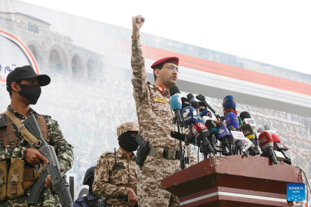 Houthi military spokesperson Yahya Sarea delivers a statement in front of a protest against U.S. airstrikes on Yemeni fuel port of Ras Isa and in solidarity with Palestinians, in Sanaa, Yemen, April 18, 2025. (Photo by Mohammed Mohammed/Xinhua)