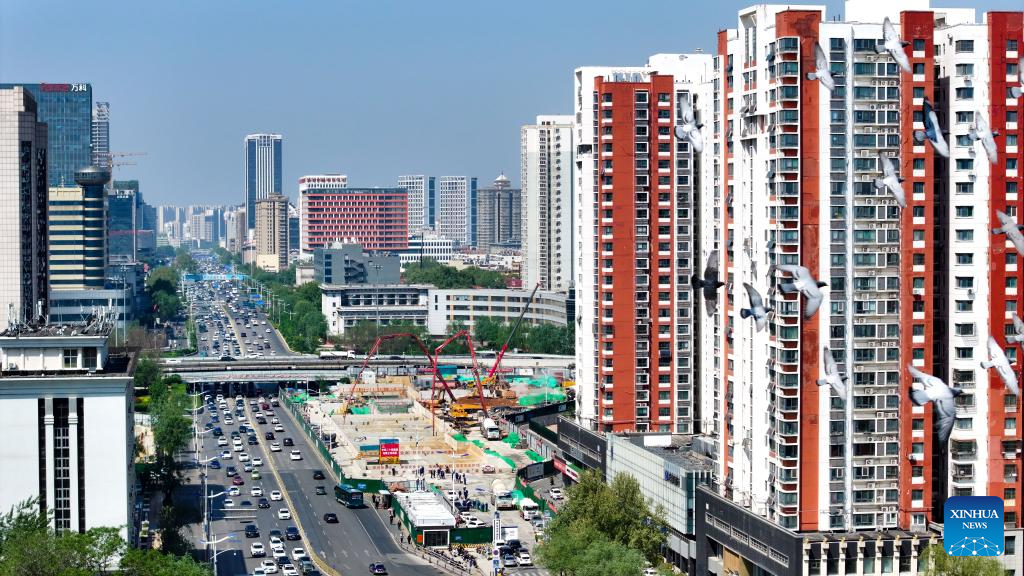 An aerial drone photo taken on April 19, 2025 shows the capping of the main structure of Bayi Overpass Station of Jinan Metro Line 4 (Phase I) in Jinan, east China's Shandong Province. With the successful capping of the main structure of Bayi Overpass Station, the construction of the main structure of Jinan Metro Line 4 (Phase I) has been completed. (Xinhua/Guo Xulei)