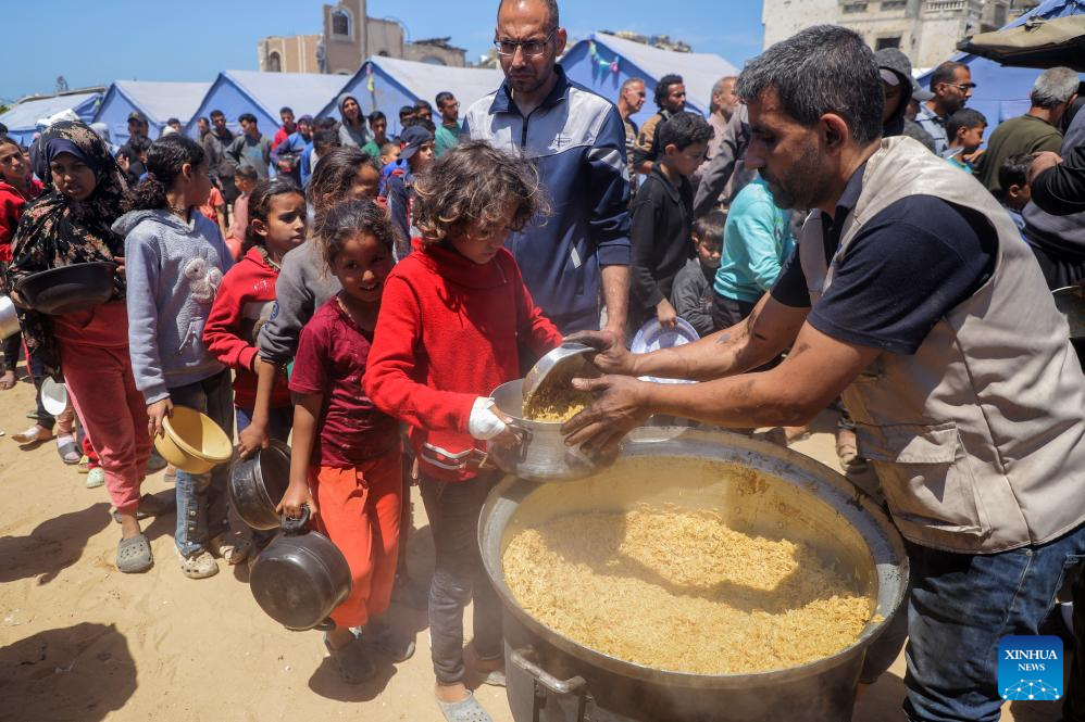 Palestinian children wait to receive free food from a food distribution center in Gaza City, on April 19, 2025. The United Nations Relief and Works Agency for Palestine Refugees in the Near East (UNRWA) said in a statement on Saturday that Gaza's border crossings have remained shut for the seventh consecutive week, preventing the entry of humanitarian aid, medical supplies, vaccines and fuel into the enclave. (Photo by Rizek Abdeljawad/Xinhua)
