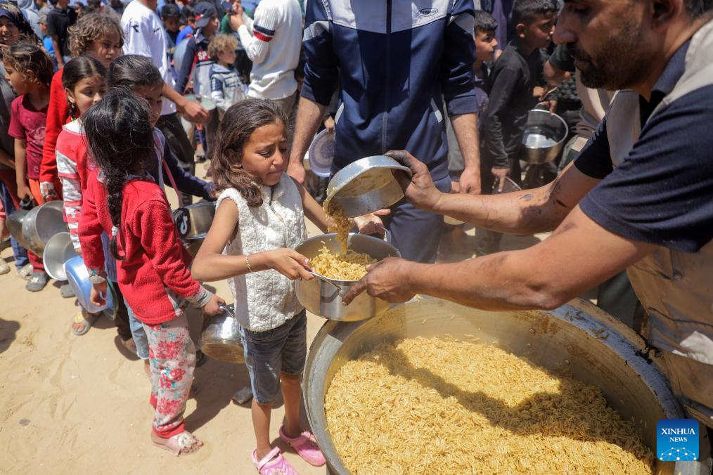 A Palestinian child receives free food from a food distribution center in Gaza City, on April 19, 2025. The United Nations Relief and Works Agency for Palestine Refugees in the Near East (UNRWA) said in a statement on Saturday that Gaza's border crossings have remained shut for the seventh consecutive week, preventing the entry of humanitarian aid, medical supplies, vaccines and fuel into the enclave. (Photo by Rizek Abdeljawad/Xinhua)