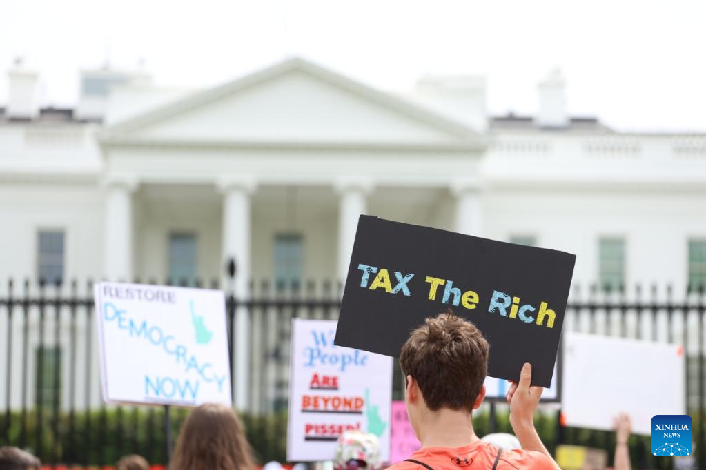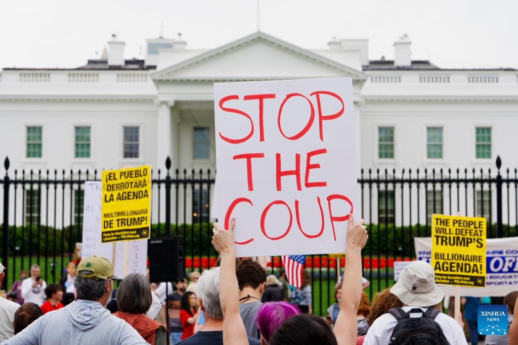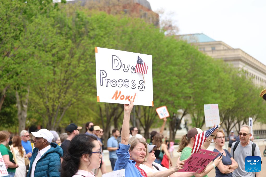 Protesters gather during a rally outside the White House in Washington, D.C., the United States, April 19, 2025. Thousands of protesters on Saturday took to the streets in various cities across the United States in what demonstrators described as part of a "National Day of Action" against President Donald Trump's policies and perceived threats to democracy. (Xinhua/Hu Yousong)