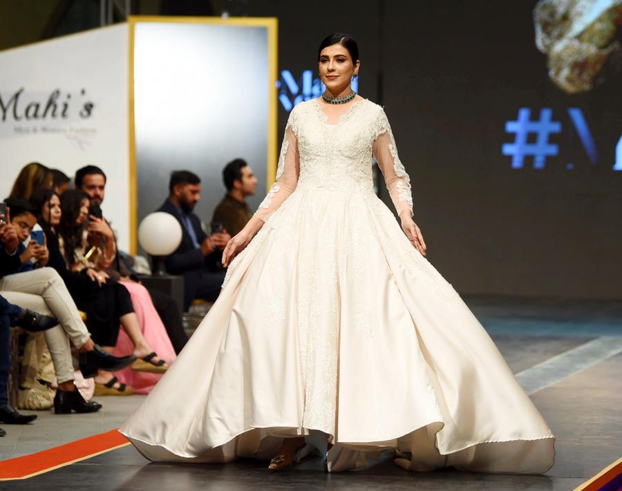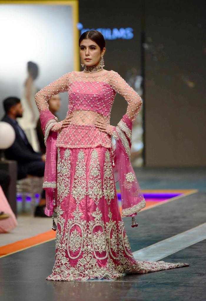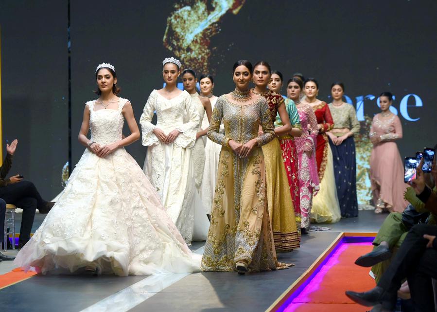 KARACHI, Pakistan, April 20 (Xinhua) -- Models were dressed in exquisite outfits with simple yet elegant make-up, showcasing the designers' masterpieces on the glittering catwalk.