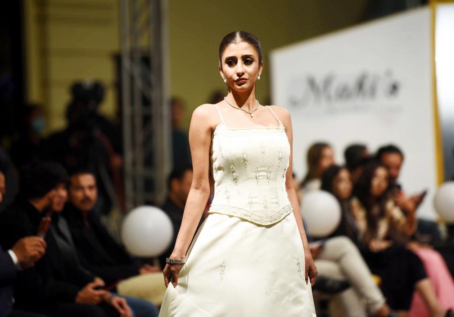 A model presents a creation during a fashion show in southern Pakistani port city of Karachi on April 19, 2025. (Str/Xinhua)