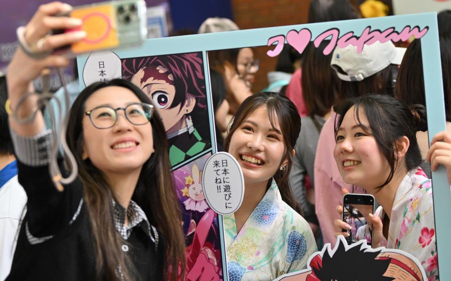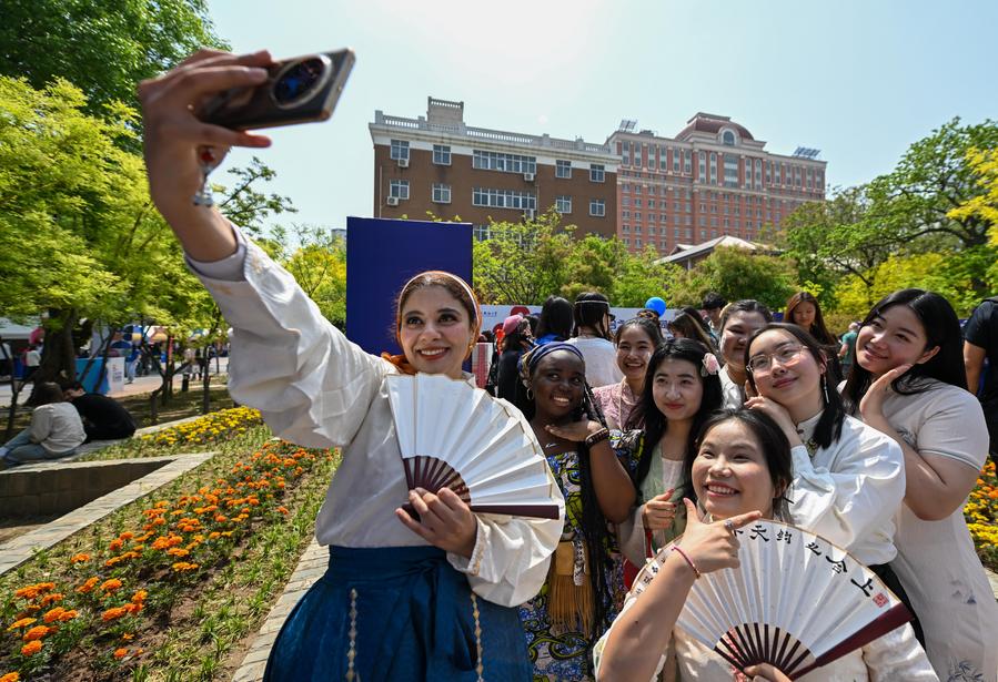 Students take selfies during the 8th International Culture Festival of Tianjin Foreign Studies University in north China's Tianjin, April 20, 2025. (Xinhua/Sun Fanyue)