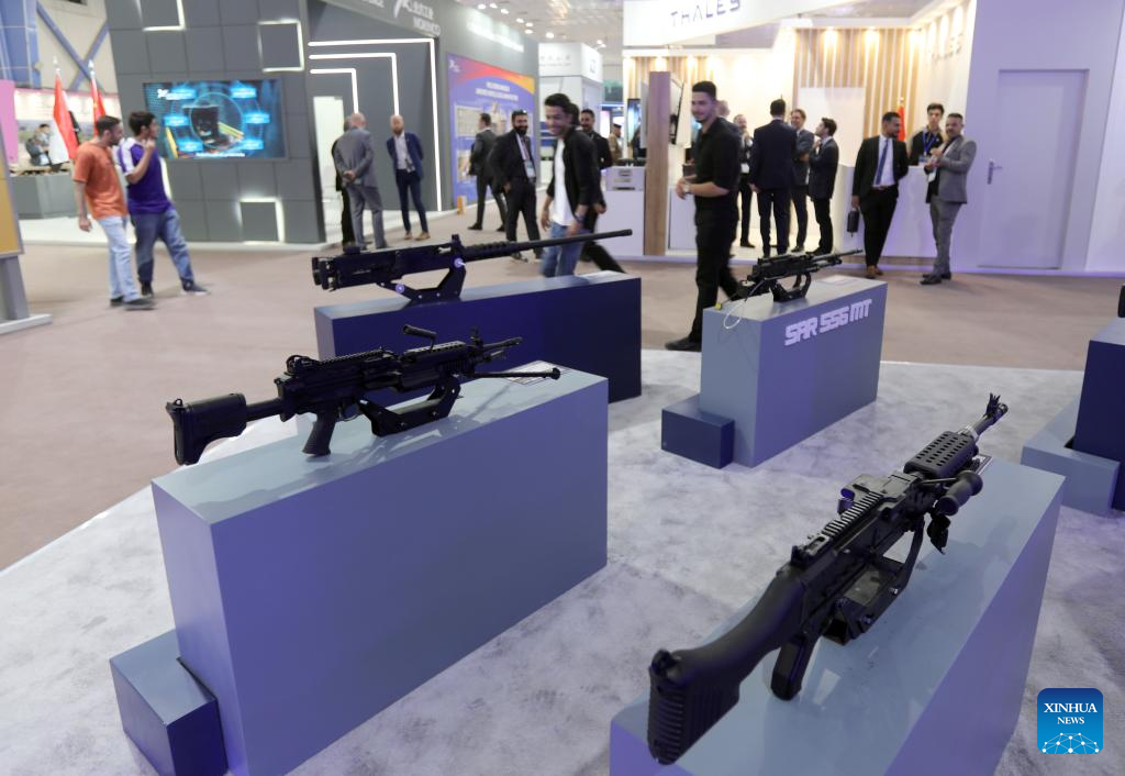 Weapons are displayed at the 13th Security, Defense, Military Industries and Cybersecurity Exhibition in Baghdad, Iraq, April 19, 2025. (Xinhua/Khalil Dawood)