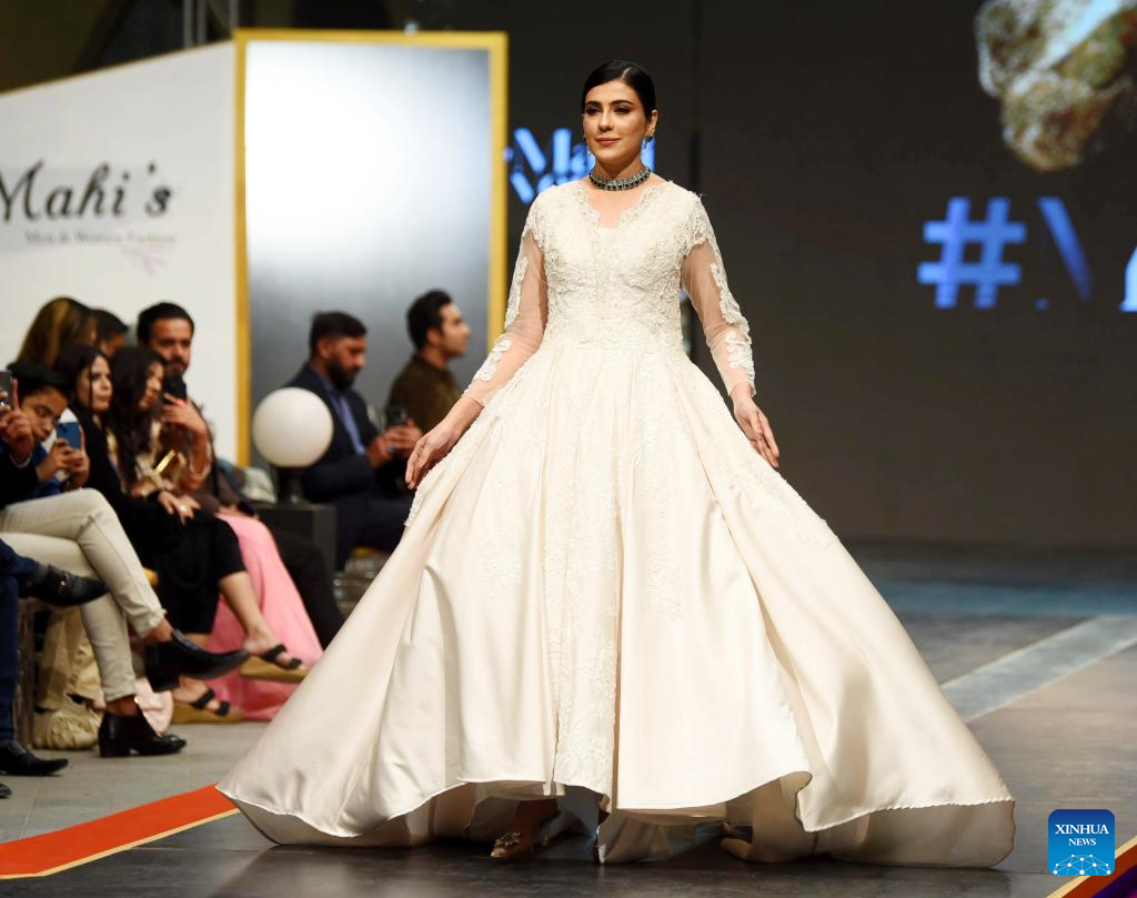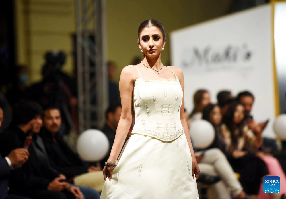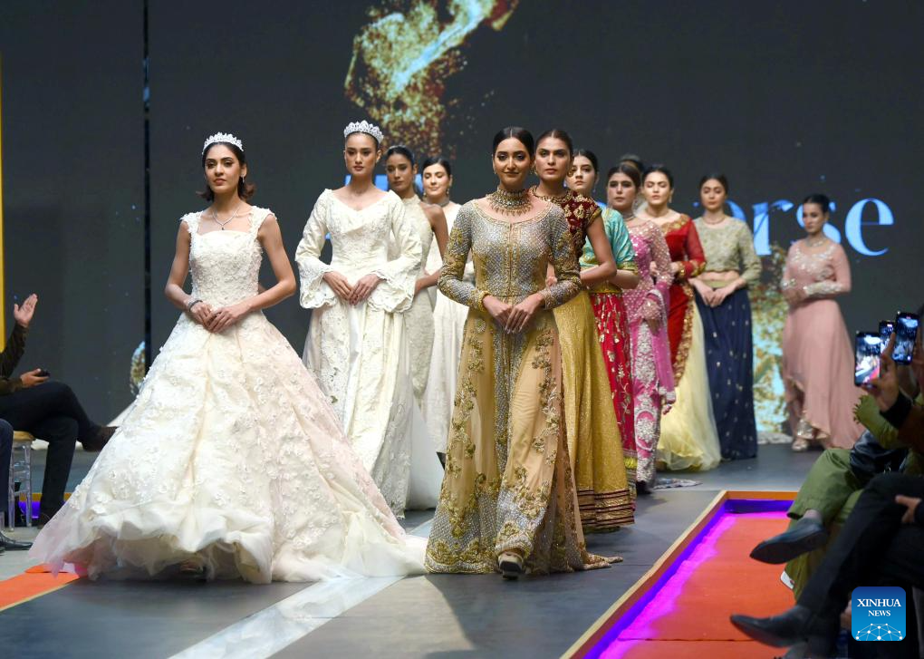 Models present creations during a fashion show in southern Pakistani port city of Karachi on April 19, 2025. (Str/Xinhua)