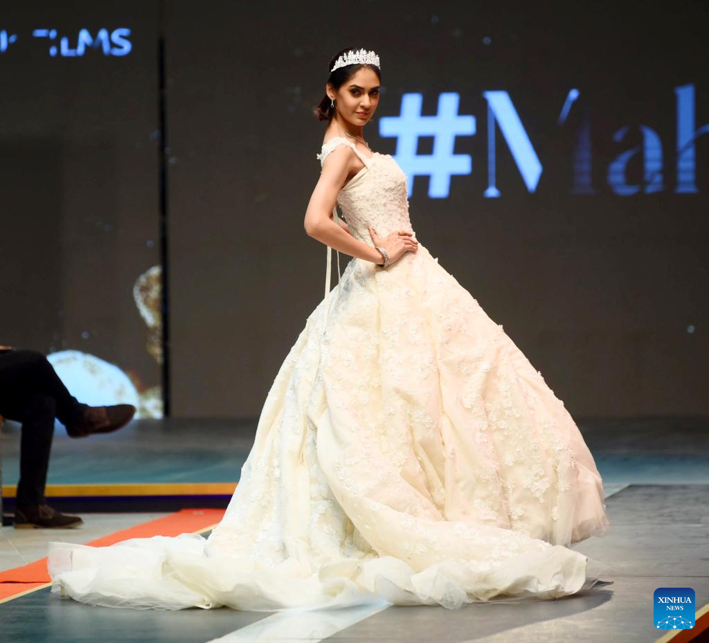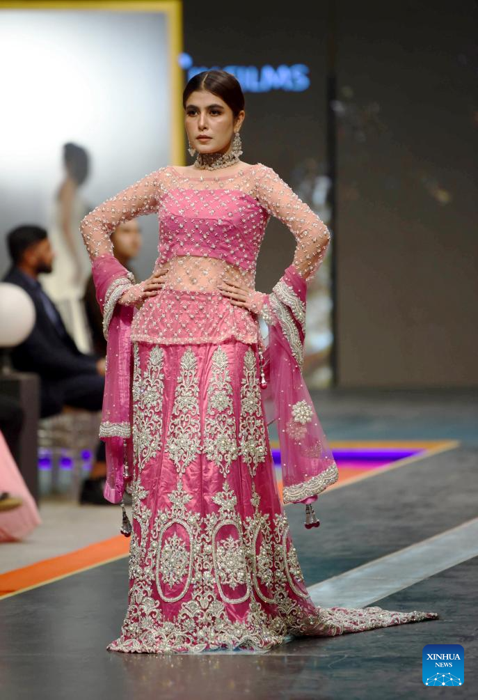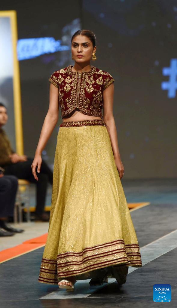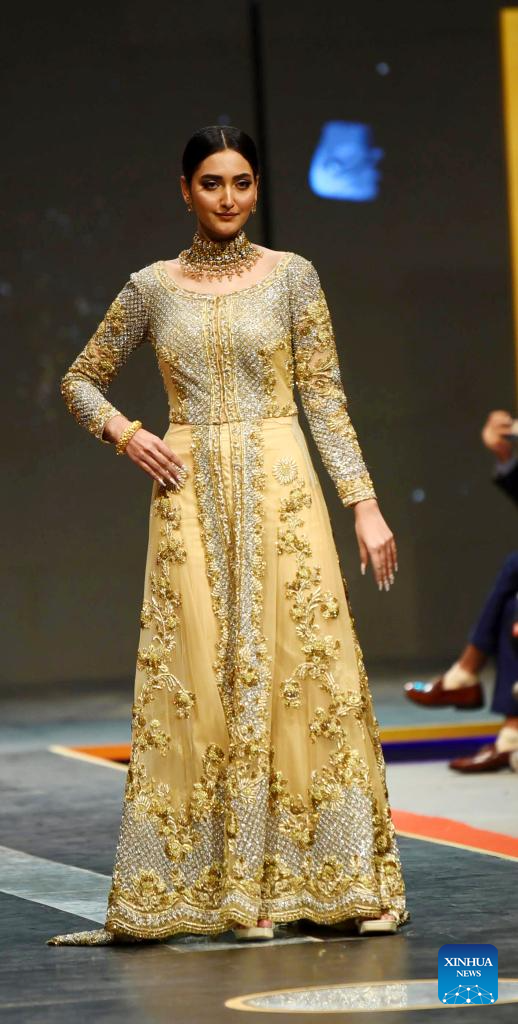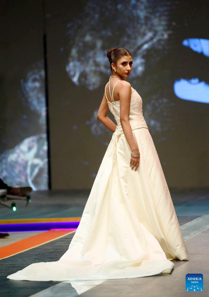 A model presents a creation during a fashion show in southern Pakistani port city of Karachi on April 19, 2025. (Str/Xinhua)