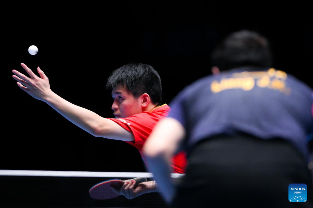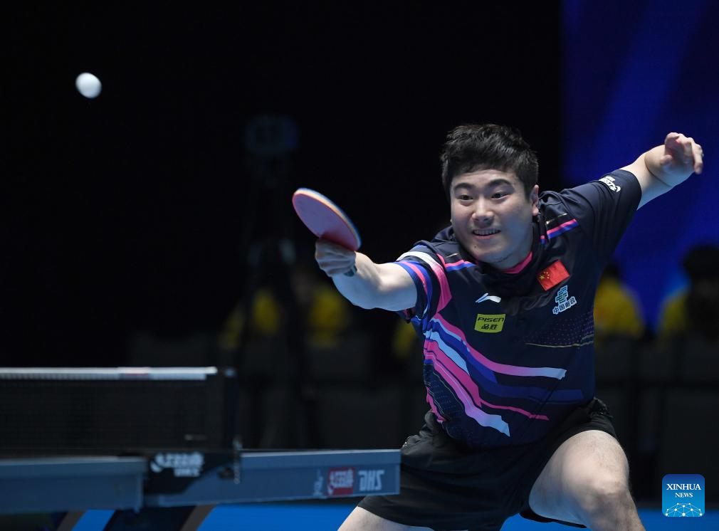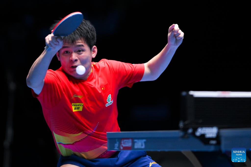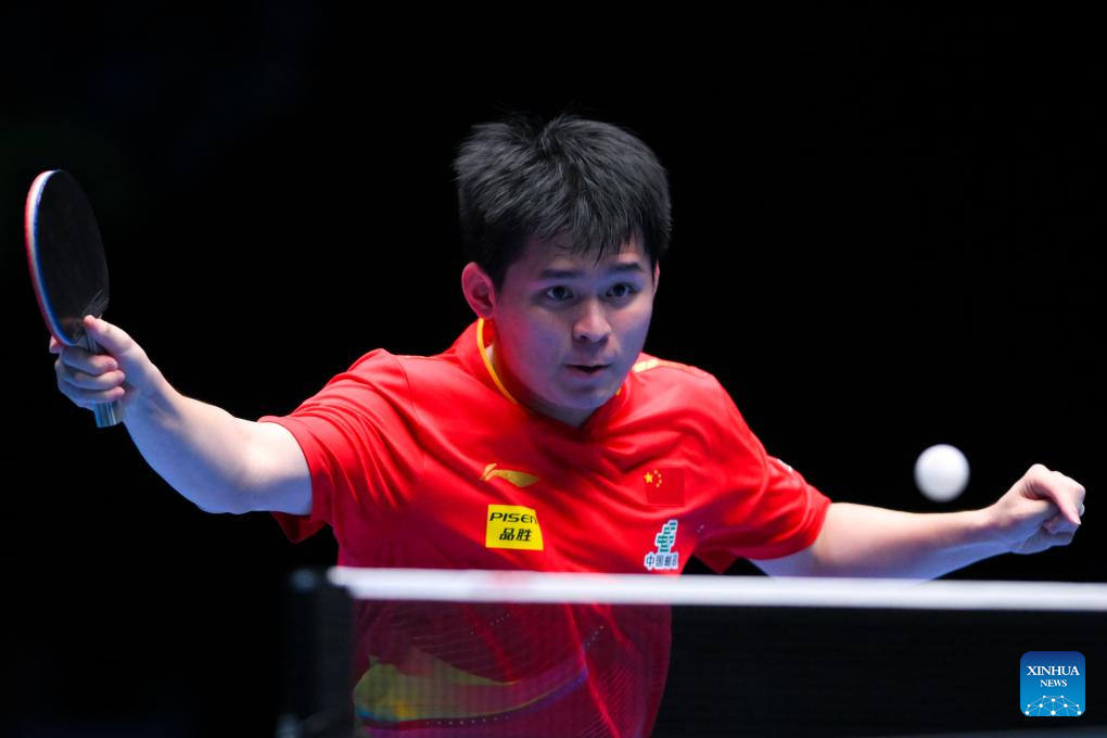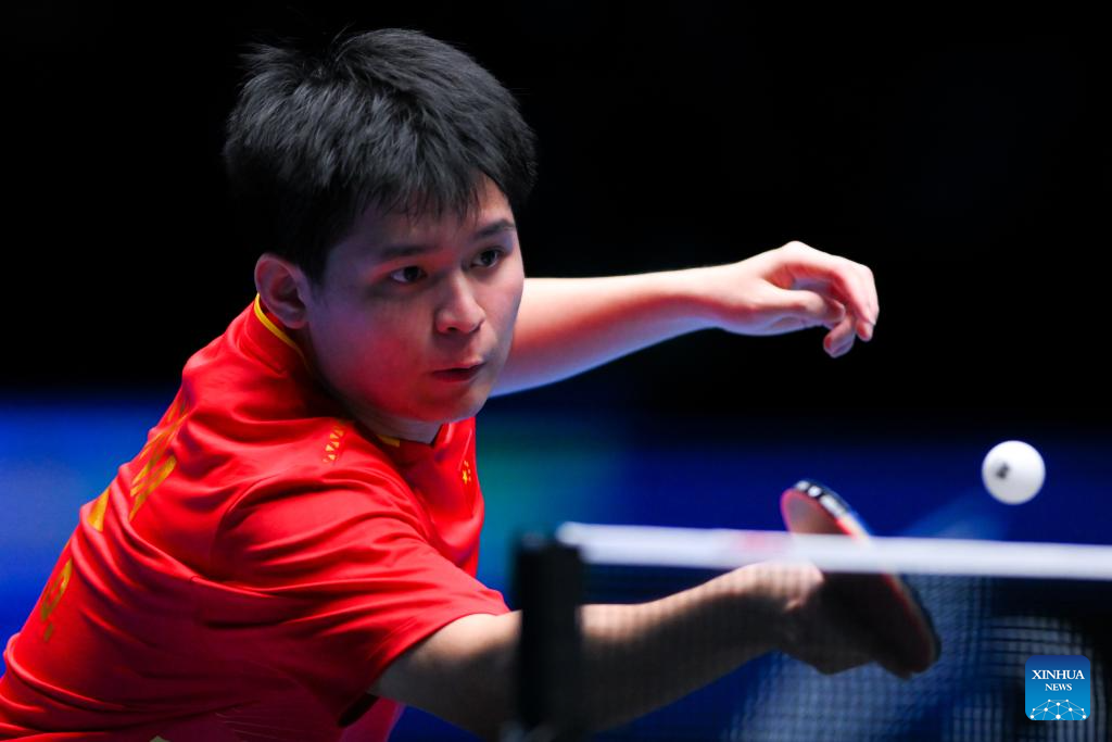 Lin Shidong hits a return during the men's singles semifinal between Lin Shidong of China and Liang Jingkun of China at the ITTF Men's and Women's World Cup 2025 in Macao, China, April 19, 2025. (Xinhua/Chen Duo)