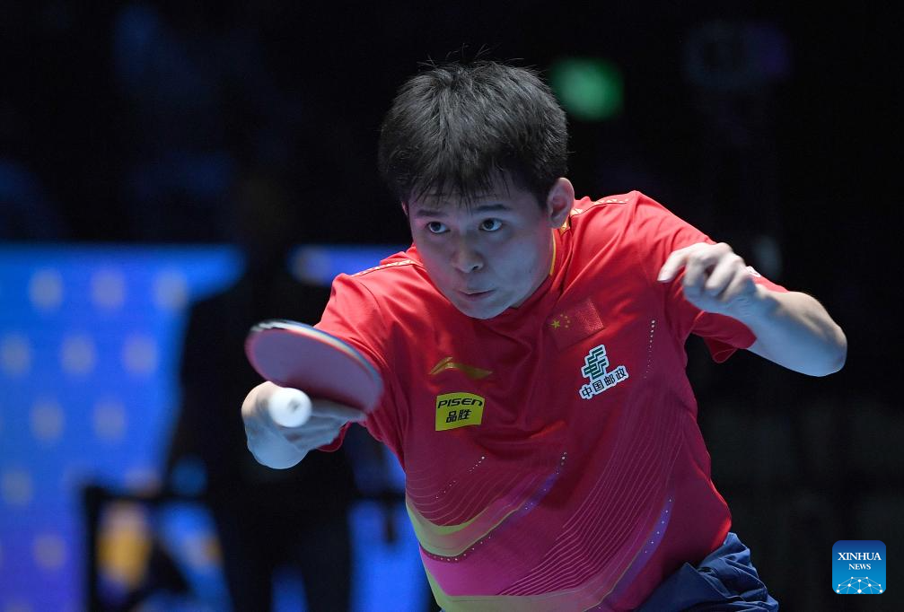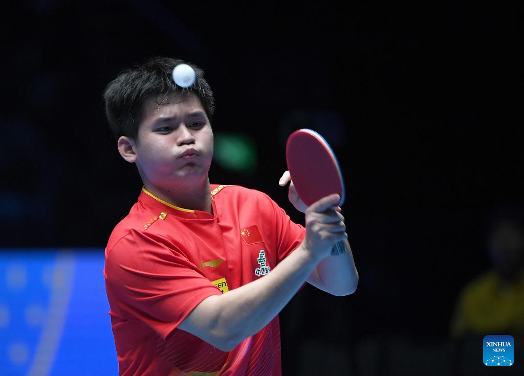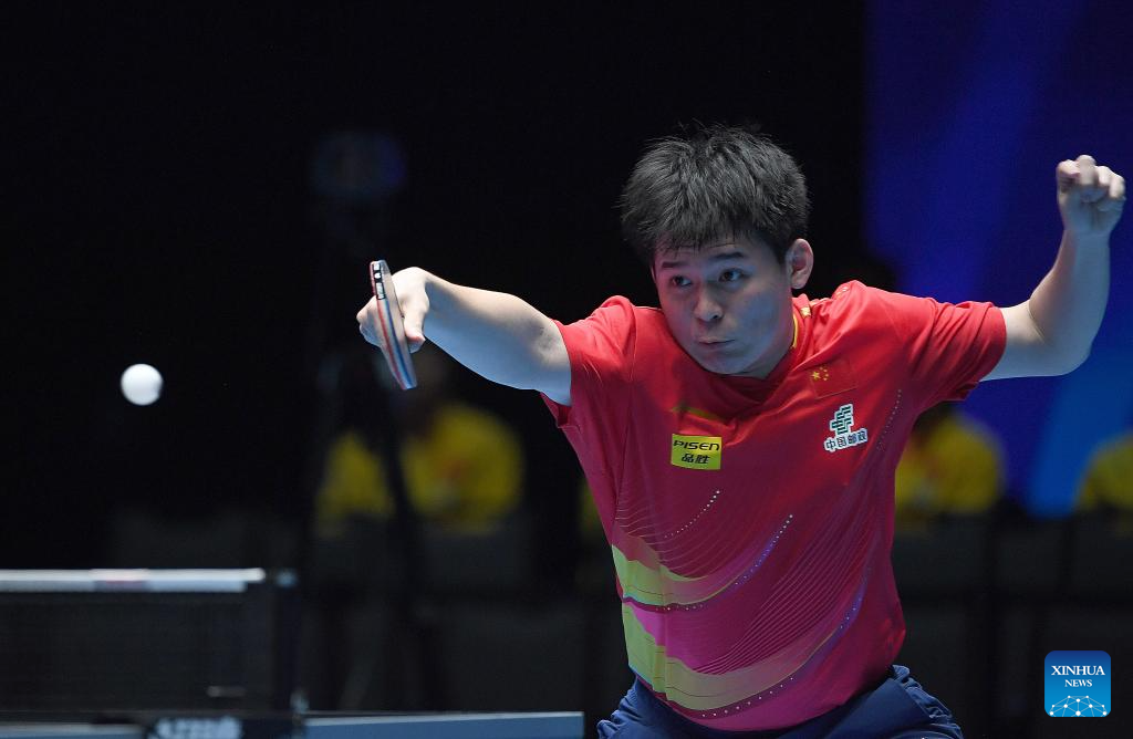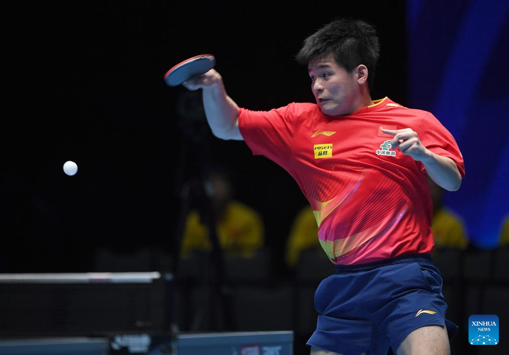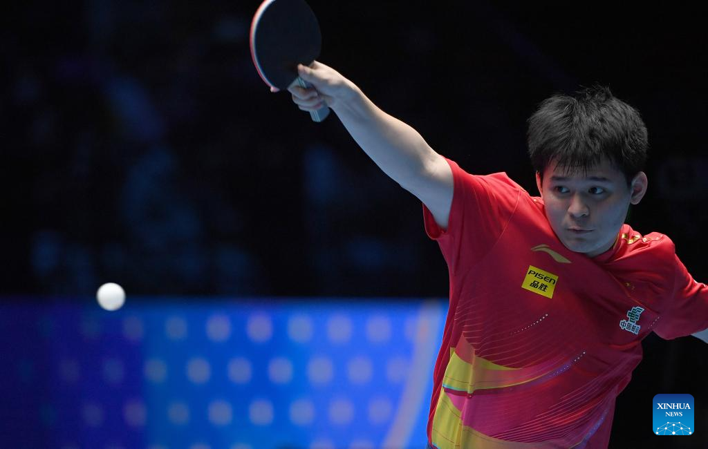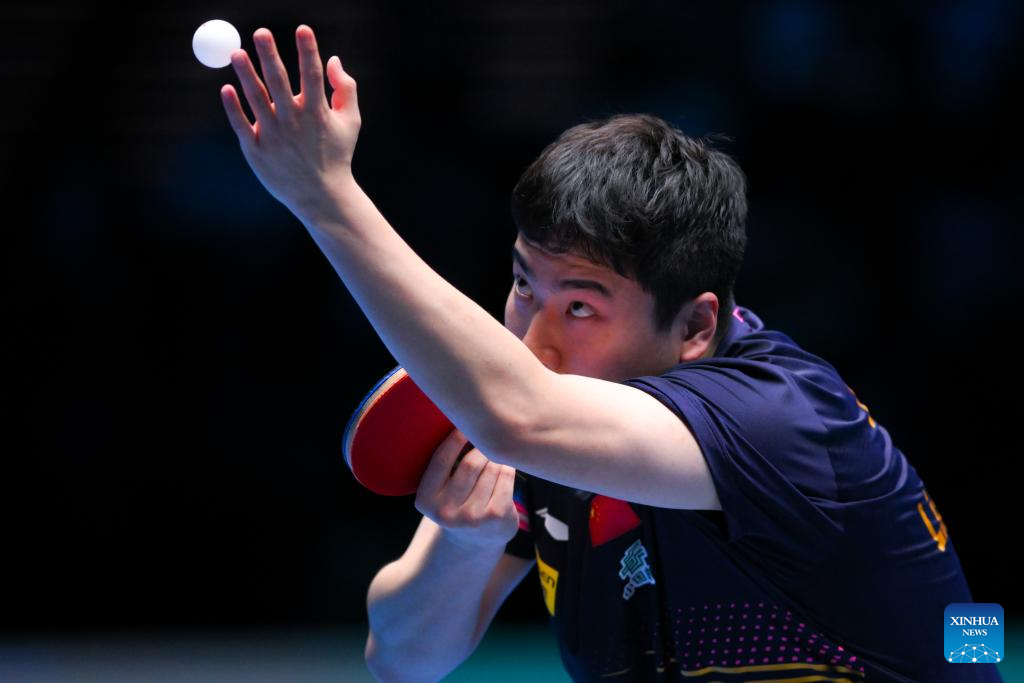 Lin Shidong hits a return during the men's singles semifinal between Lin Shidong of China and Liang Jingkun of China at the ITTF Men's and Women's World Cup 2025 in Macao, China, April 19, 2025. (Xinhua/Chen Duo)