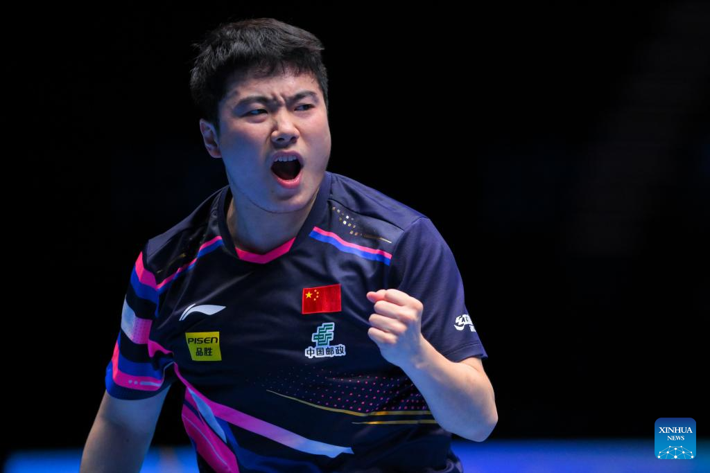Liang Jingkun celebrates scoring during the men's singles semifinal between Lin Shidong of China and Liang Jingkun of China at the ITTF Men's and Women's World Cup 2025 in Macao, China, April 19, 2025. (Xinhua/Cheong Kam Ka)