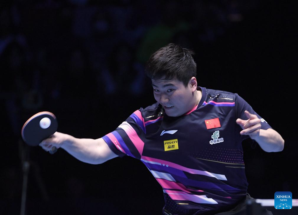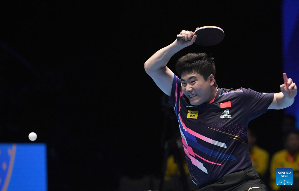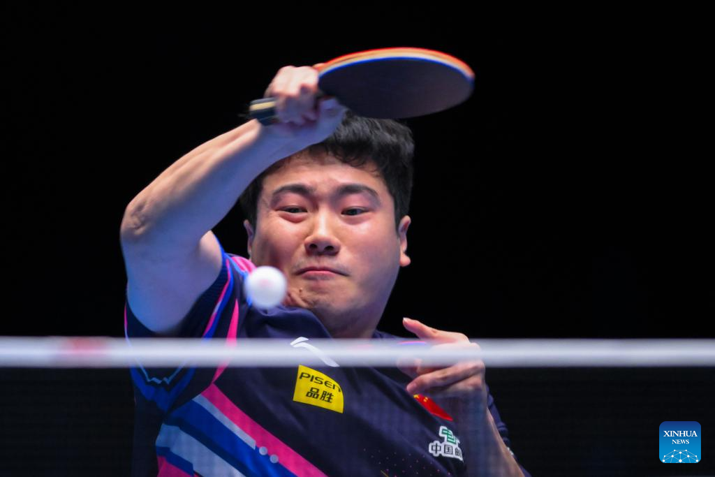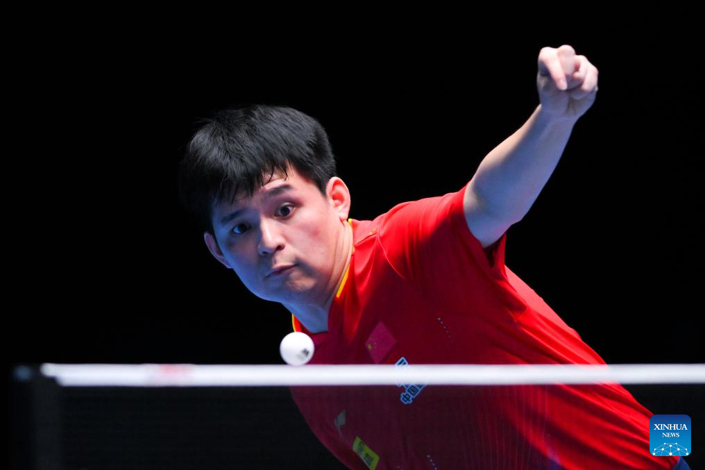 Lin Shidong hits a return during the men's singles semifinal between Lin Shidong of China and Liang Jingkun of China at the ITTF Men's and Women's World Cup 2025 in Macao, China, April 19, 2025. (Xinhua/Cheong Kam Ka)