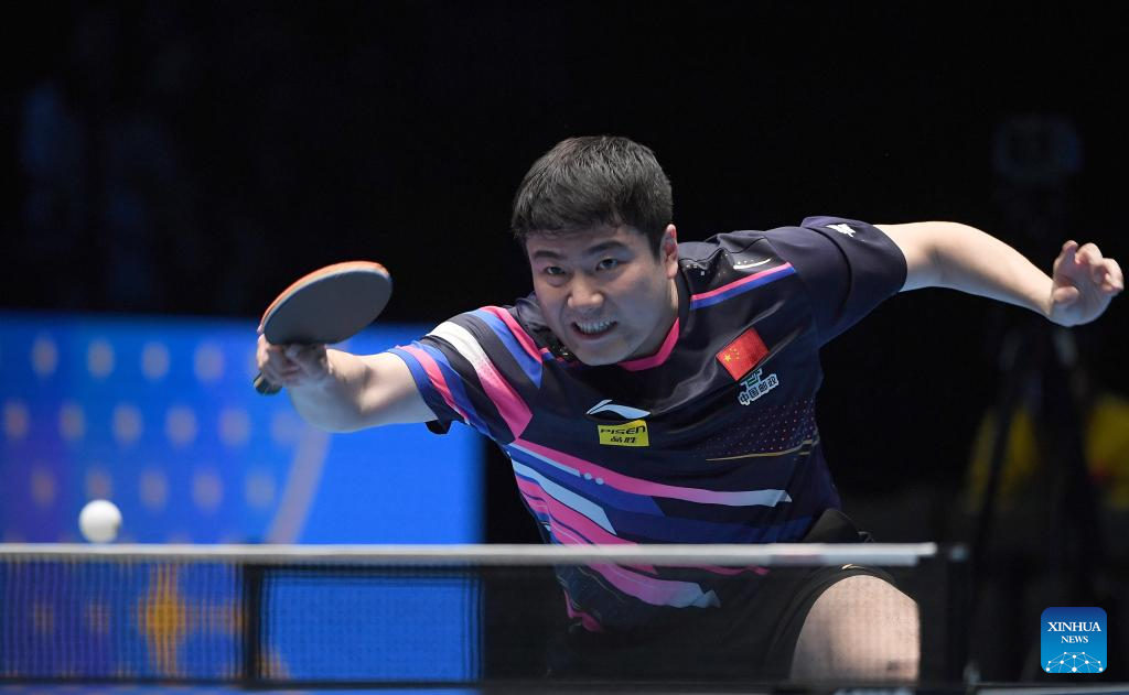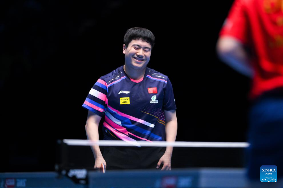 Liang Jingkun hits a return during the men's singles semifinal between Lin Shidong of China and Liang Jingkun of China at the ITTF Men's and Women's World Cup 2025 in Macao, China, April 19, 2025. (Xinhua/Chen Duo)