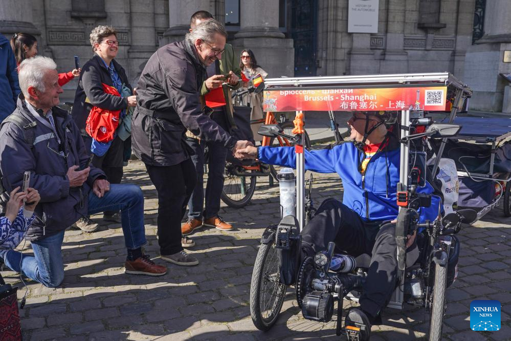 Claude Brouir (1st R) shakes hands with a friend before starting his journey "Bike2Shanghai" in Brussels, Belgium, on April 19, 2025. (Xinhua/Peng Ziyang)