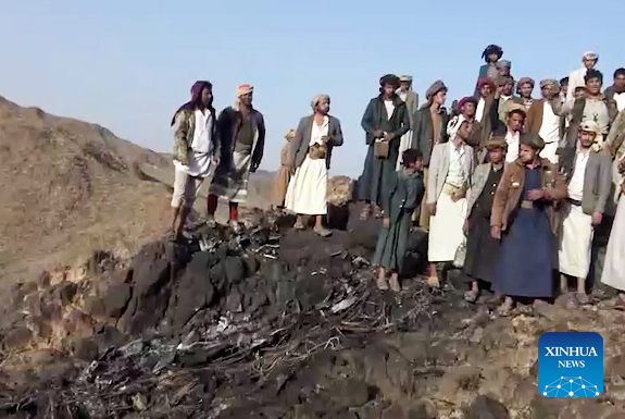 This video screenshot provided by the Houthi media outlets shows Yemeni villagers checking the wreckage of the U.S. MQ-9 drone in Sanaa province, Yemen, April 19, 2025. Yemen's Houthi group said Saturday it shot down another U.S.-made MQ-9 drone over Sanaa province in the past 24 hours. (Xinhua)