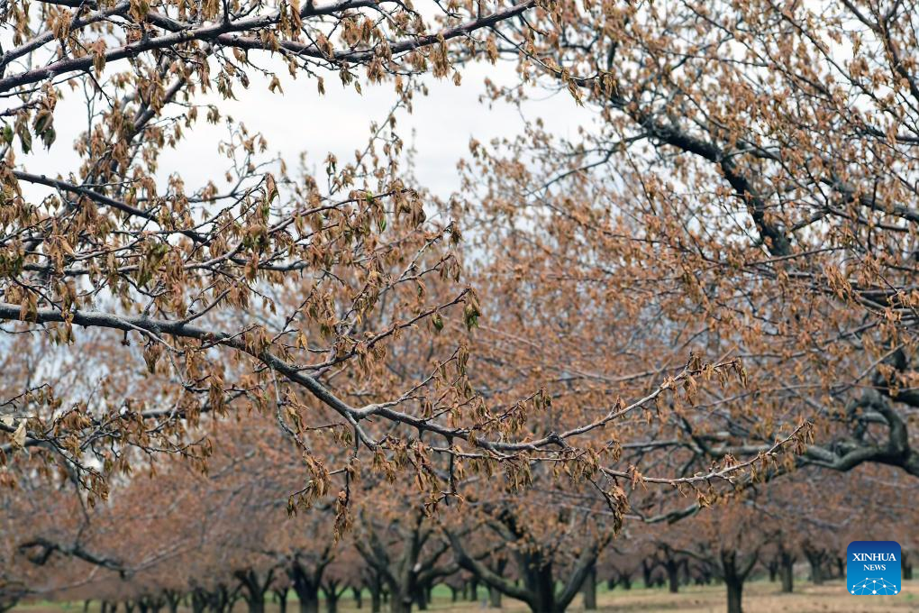 This photo taken on April 19, 2025 shows apricot trees affected by frost at an apricot orchard in Malatya, Türkiye. (Mustafa Kaya/Handout via Xinhua)