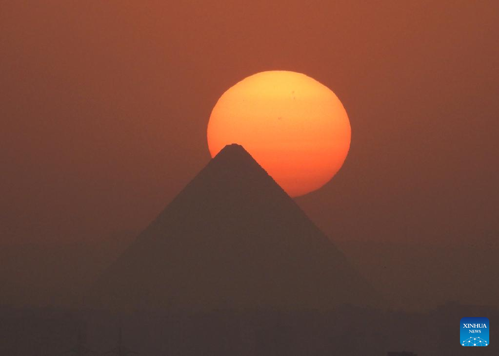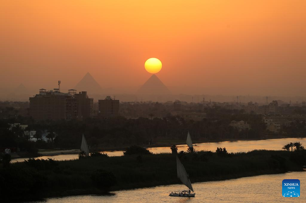 This photo taken on April 19, 2025 shows the Giza Pyramids at sunset seen from Cairo, Egypt. (Xinhua/Wang Dongzhen)