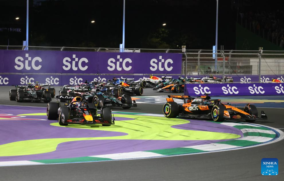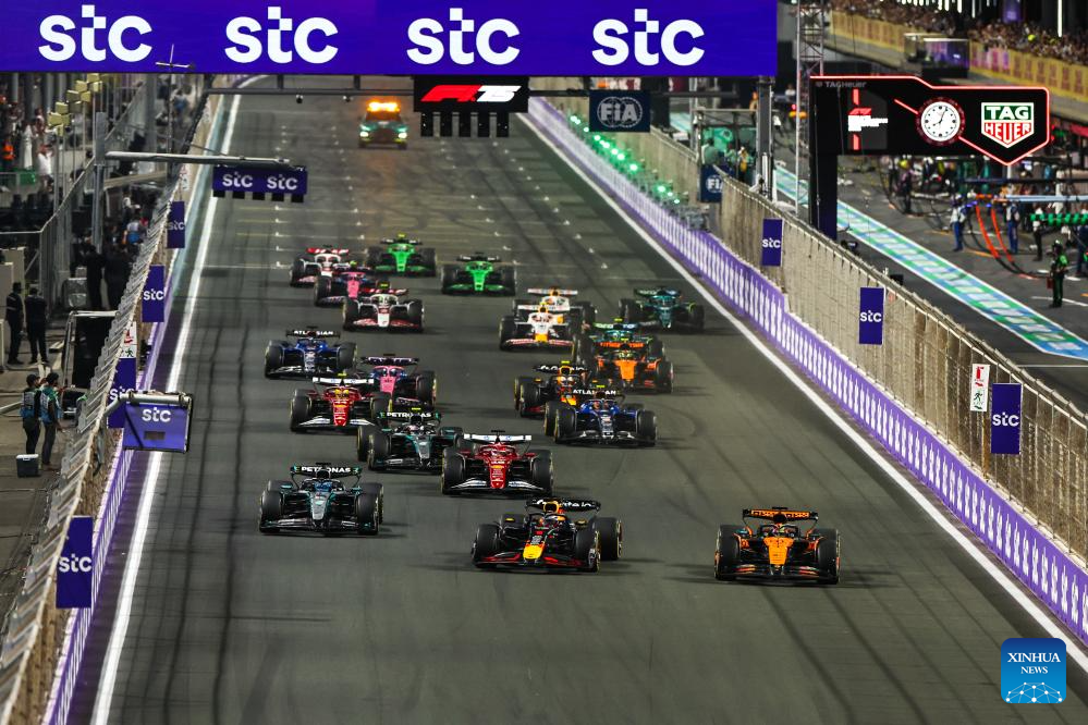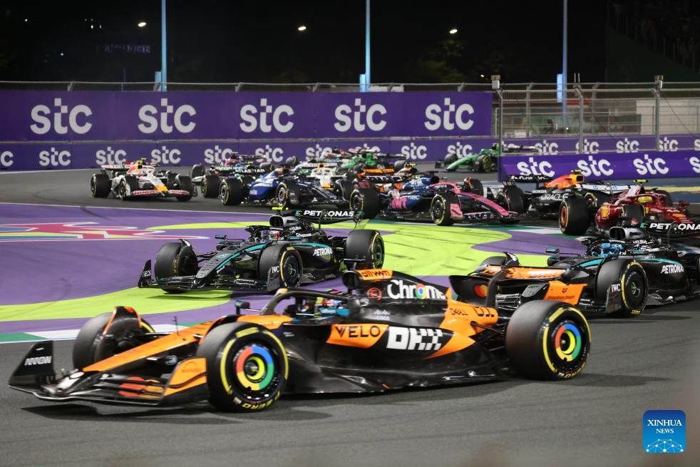 Race cars speed off from the starting line during the race of the Formula One Saudi Arabia Grand Prix at the Jeddah Corniche Circuit in Jeddah, Saudi Arabia, on April 20, 2025. (Photo by Qian Jun/Xinhua)