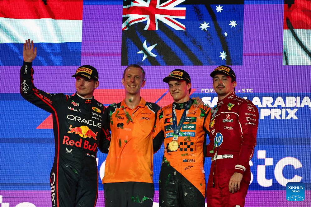 Second placed Red Bull's driver Max Verstappen (1st L) of the Netherlands, first placed McLaren's driver Oscar Piastri (2nd R) of Australia and third placed Ferrari's driver Charles Leclerc (1st R) of Monaco pose at the awarding ceremony after the race of the Formula One Saudi Arabia Grand Prix at the Jeddah Corniche Circuit in Jeddah, Saudi Arabia, on April 20, 2025. (Xinhua/Wang Haizhou)