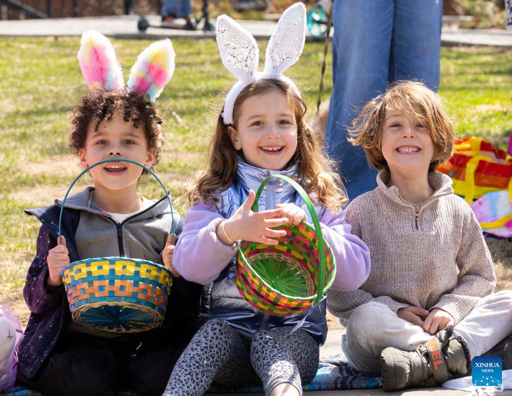 Children wearing bunny ear headbands are pictured during the 2025 Toronto Beaches Lions Easter Parade in Toronto, Canada, April 20, 2025. (Photo by Zou Zheng/Xinhua)
