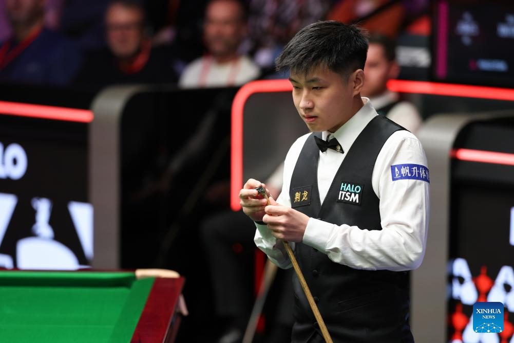 Zhao Xintong of China plays a shot during the round 1 match against Jak Jones of Wales at World Snooker Championship 2025 in Sheffield, Britain, April 21, 2025. (Photo by Zhai Zheng/Xinhua)