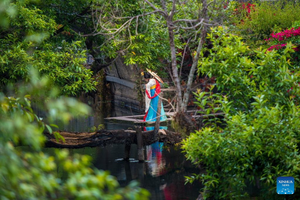 A visitor wearing traditional costumes poses for a photo at the ancient town of Heshun in Tengchong, southwest China's Yunnan Province, April 19, 2025. (Photo by Peng Yikai/Xinhua)