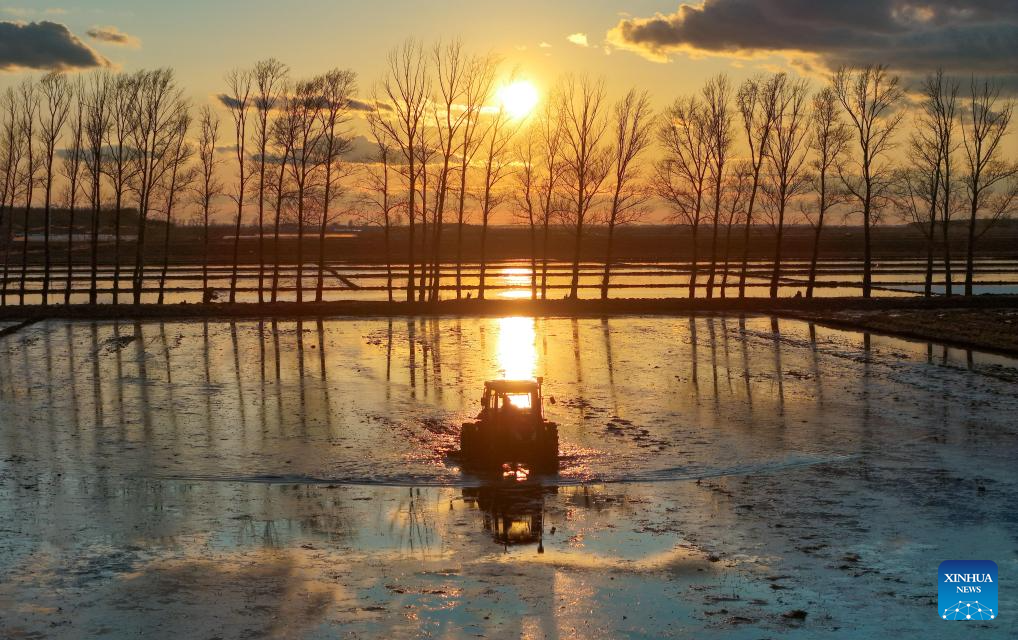 A drone photo taken on April 20, 2025 shows a farmer working at a field in Caiyuan Village, Fujin City of northeast China's Heilongjiang Province. Sunday marks Guyu, or Grain Rain, which is the sixth of the 24 traditional Chinese solar terms, signifying the onset of the rainy season, a favorable time for planting and the growth of crops. (Photo by Qu Yubao/Xinhua)