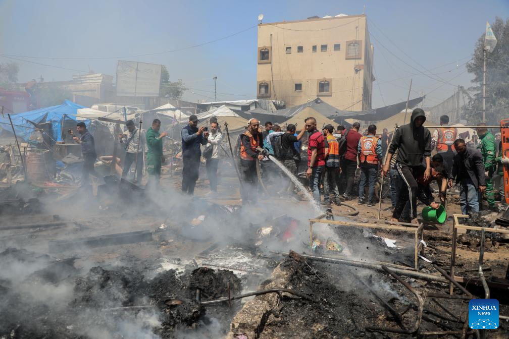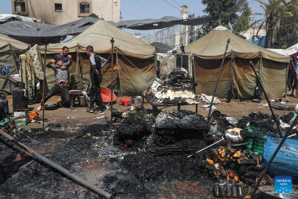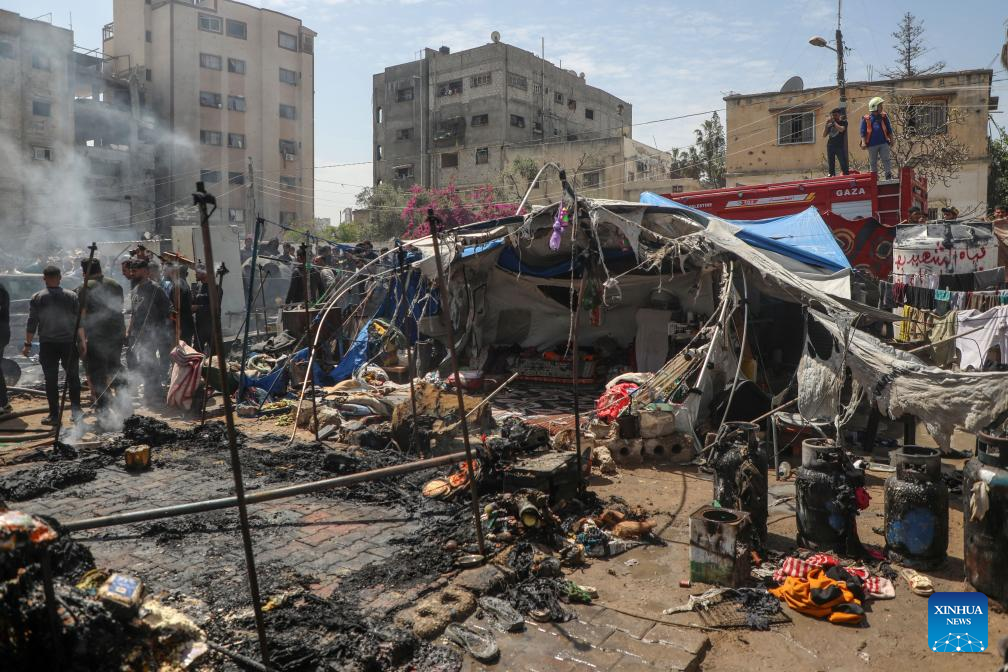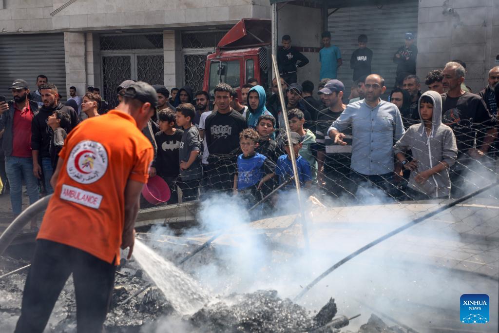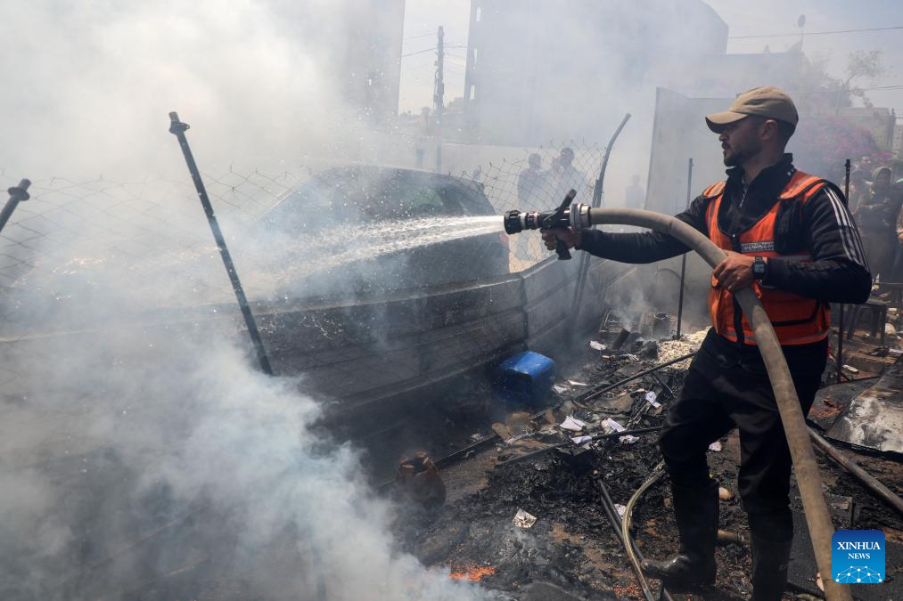 Firefighters put out a fire after an Israeli airstrike in Gaza City, on April 21, 2025. Israel's military said on Monday that it carried out more than 200 airstrikes across the Gaza Strip over the past three days, killing a member of the Islamic Jihad movement. (Photo by Rizek Abdeljawad/Xinhua)