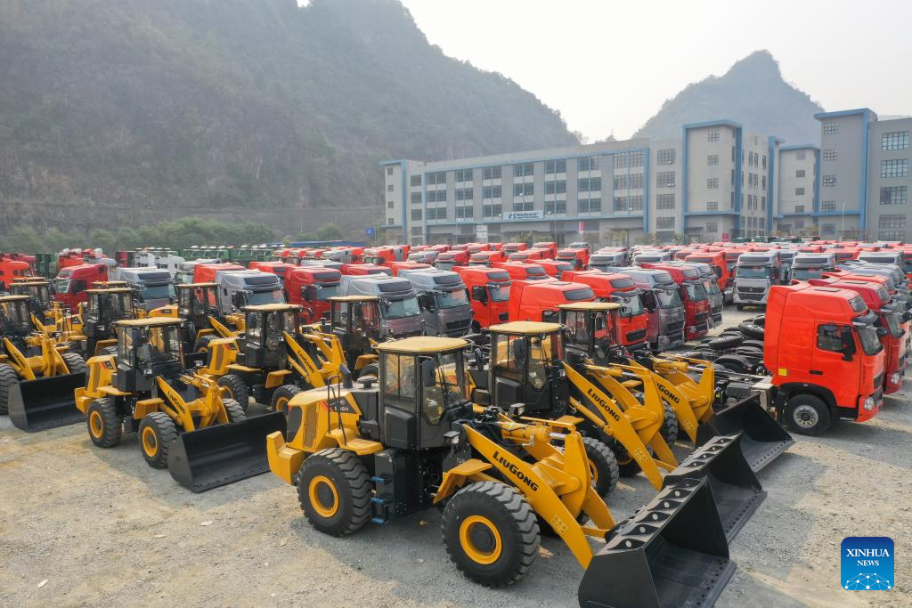 A truck loaded with mechanical equipment prepares to leave for Ningxia Hui Autonomous Region at a logistics center in Liuzhou, south China's Guangxi Zhuang Autonomous Region, March 12, 2025. (Xinhua/Cao Yiming)