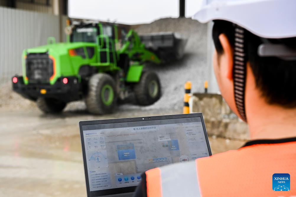 A staff member conducts performance test on an unmanned loader at an equipment manufacturing company in Liuzhou, south China's Guangxi Zhuang Autonomous Region, March 12, 2025. (Xinhua/Cao Yiming)