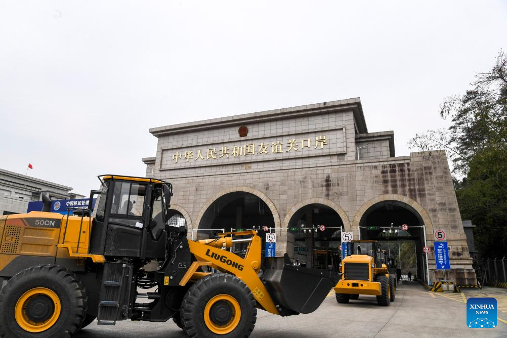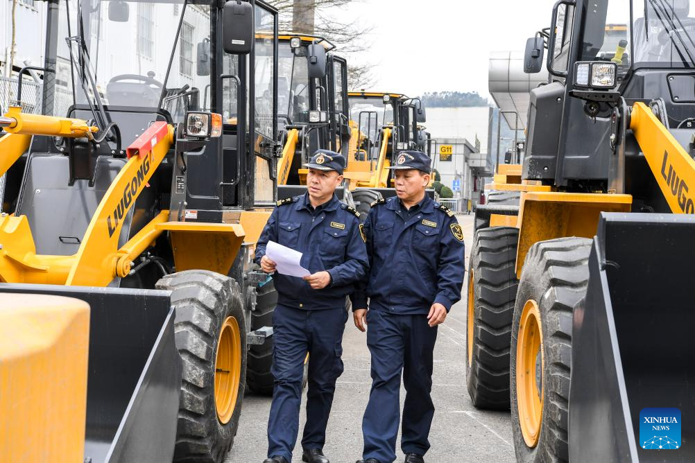 Customs officers inspect loaders for export to Vietnam at the port of the Friendship Pass in Pingxiang, south China's Guangxi Zhuang Autonomous Region, March 17, 2025. (Xinhua/Cao Yiming)