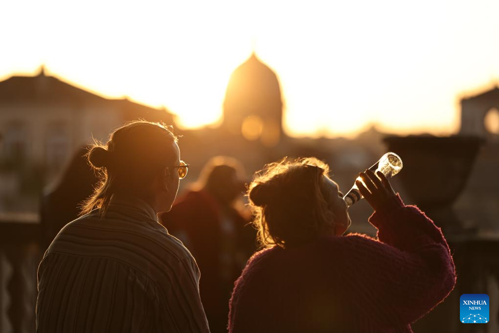 People watch the sunset in Rome, Italy, during the Easter holiday on April 21, 2025. (Xinhua/Li Jing)
