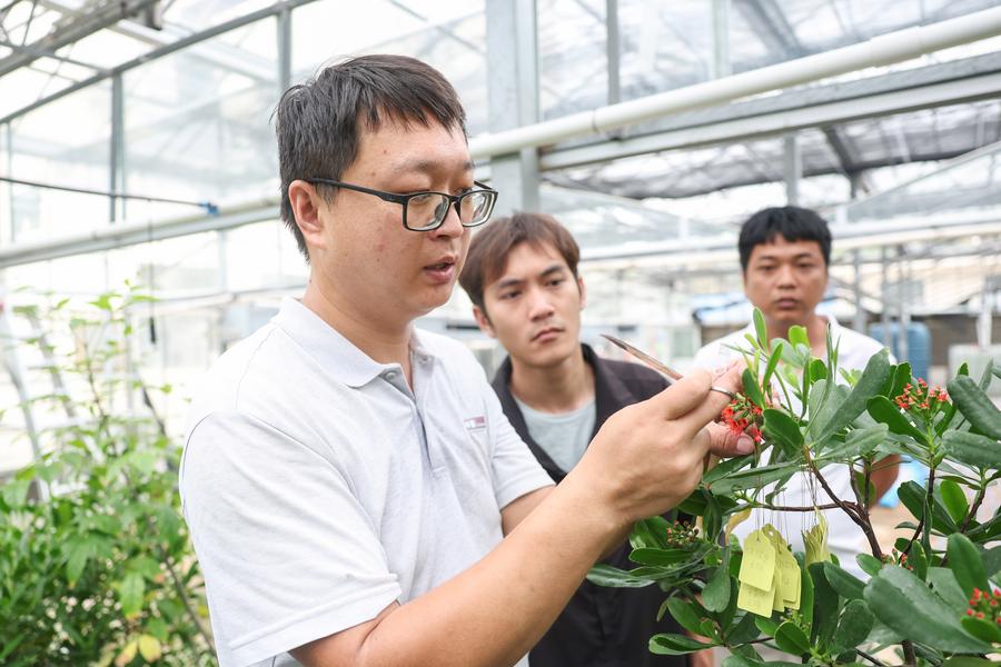 Wang Bingyu, a researcher from Sanya Academy of Forestry, conducts an artificial pollination experiment on a Lumnitzera littorea plant at a greenhouse of the academy in Sanya, south China's Hainan Province, April 10, 2025. (Xinhua/Zhang Liyun)Zeng Dehua, a researcher from Sanya Academy of Forestry, checks a Lumnitzera littorea seedling at Tielu port mangrove nature reserve in Sanya, south China's Hainan Province, April 9, 2025. (Xinhua/Zhang Liyun)Lumnitzera littorea seedlings are pictured at a greenhouse of Sanya Academy of Forestry in Sanya, south China's Hainan Province, April 10, 2025. (Xinhua/Zhang Liyun)Zeng Dehua, a researcher from Sanya Academy of Forestry, transplants a Lumnitzera littorea seedling at a greenhouse of the academy in Sanya, south China's Hainan Province, April 9, 2025. (Xinhua/Zhang Liyun)Wang Bingyu (L), a researcher from Sanya Academy of Forestry, conducts an artificial pollination experiment on a Lumnitzera littorea plant at a greenhouse of the academy in Sanya, south China's Hainan Province, April 10, 2025. (Xinhua/Zhang Liyun)
