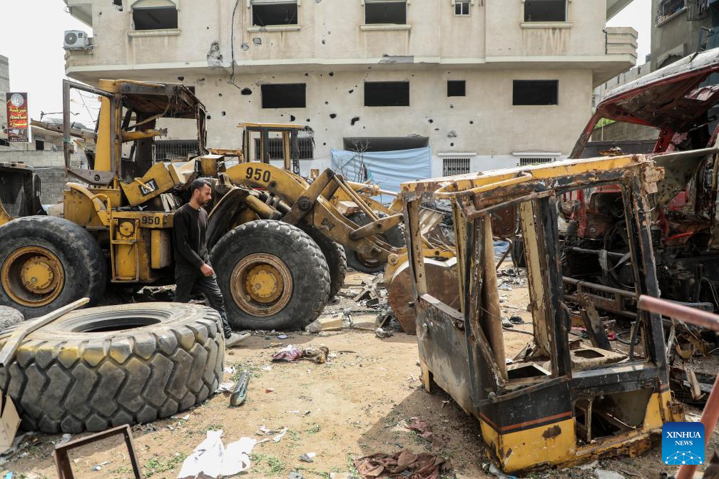 A Palestinian checks the damage of vehicles and bulldozers after an Israeli airstrike in Gaza City, on April 22, 2025. At least 25 Palestinians were killed in a wave of Israeli attacks targeting several areas across the Gaza Strip overnight, the territory's Civil Defense said on Tuesday. (Photo by Rizek Abdeljawad/Xinhua)