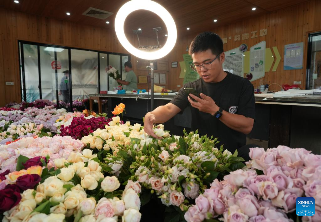 Zhan and Liu now operate two production bases covering a planting area of over 40 mu (about 2.67 hectares), where they grow more than 400 varieties of Rosa Chinensis. They sell fresh-cut flowers through e-commerce platforms and also open the planting base for sightseeing and flower-picking. During flower seasons in spring and autumn, the garden attracts an average of 500 daily visitors, creating annual sales exceeding 2 million yuan (about 273,000 U.S. dollars). The planting base also creates job opportunities for local farmers. (Xinhua/Weng Xinyang)