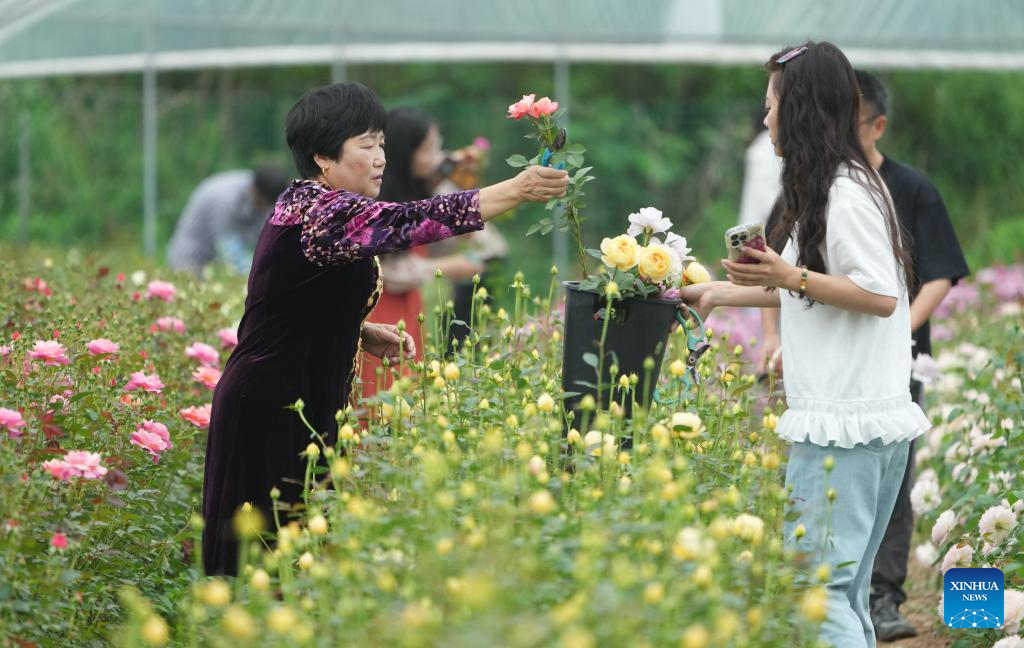 Visitors pick Chinese roses at a Chinese rose production base in Longyou County, east China's Zhejiang Province, April 22, 2025. (Xinhua/Weng Xinyang)
