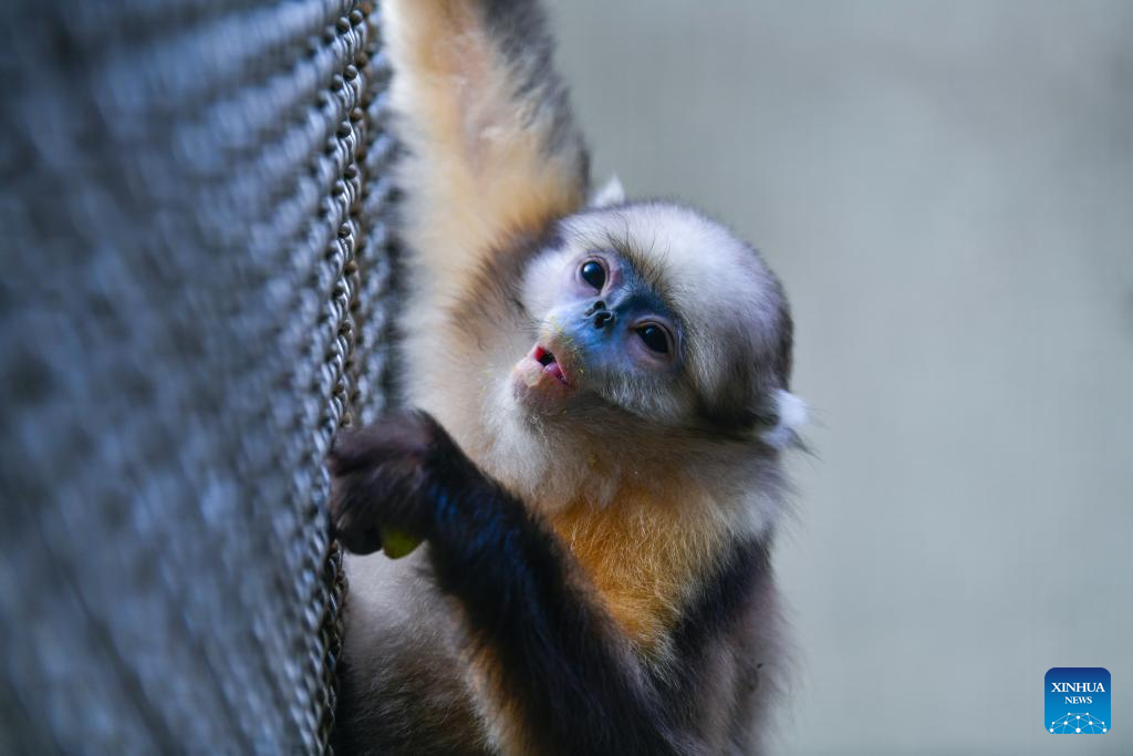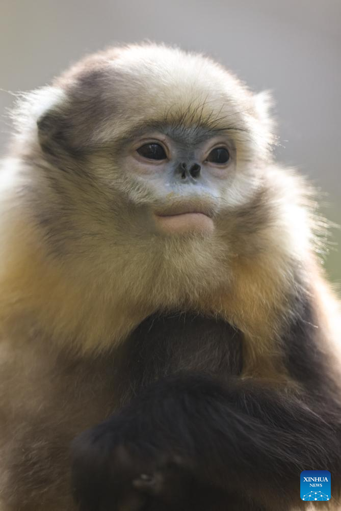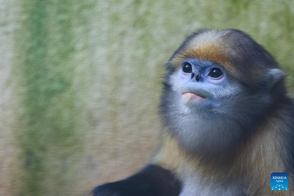 A Guizhou snub-nosed monkey is seen in a Guizhou snub-nosed monkey research center of Mount Fanjing National Nature Reserve in southwest China's Guizhou Province, April 15, 2025. (Xinhua/Yang Wenbin)