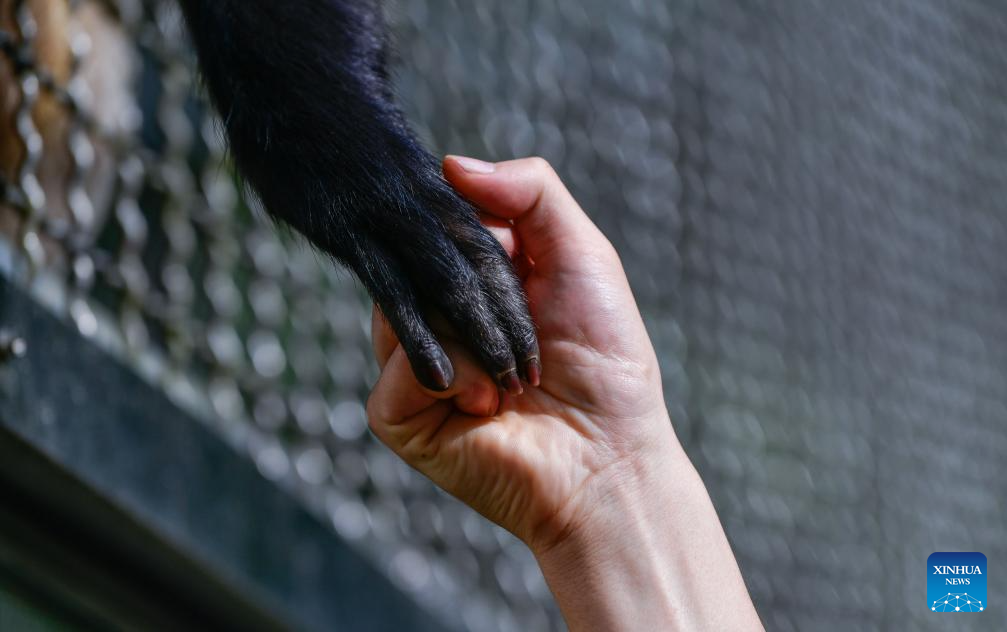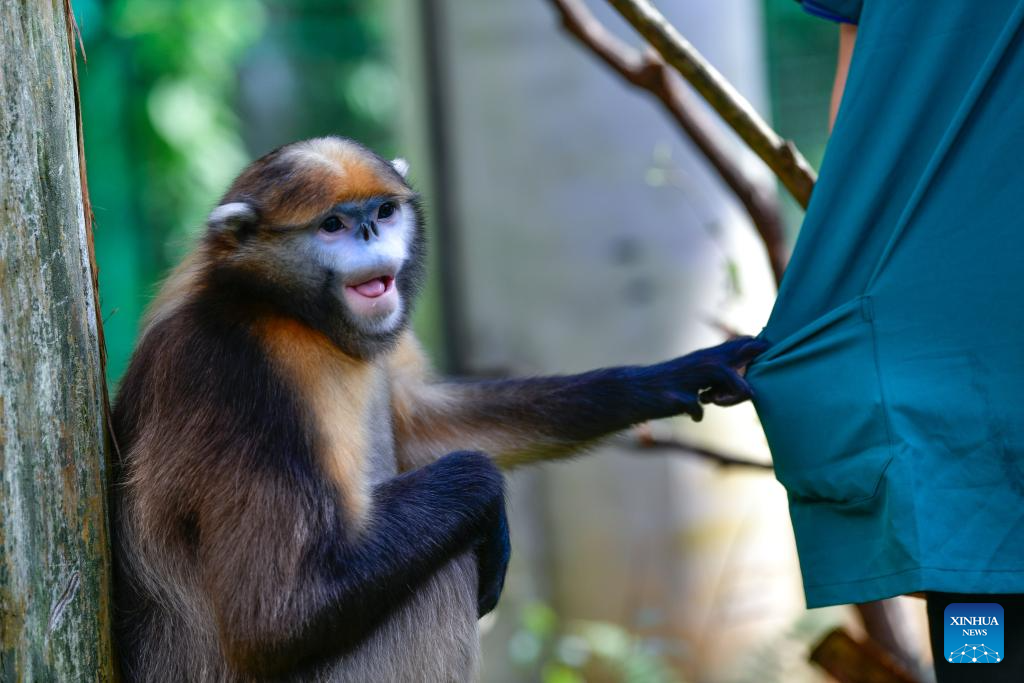 A keeper interacts with a Guizhou snub-nosed monkey in a Guizhou snub-nosed monkey research center of Mount Fanjing National Nature Reserve in southwest China's Guizhou Province, April 15, 2025. (Xinhua/Yang Wenbin)
