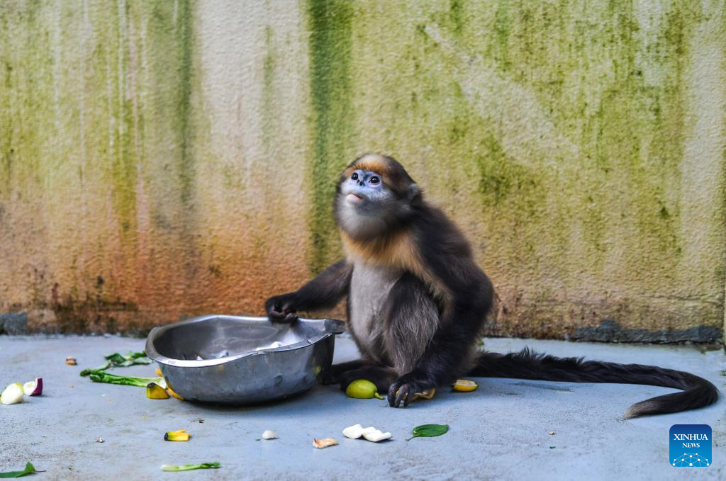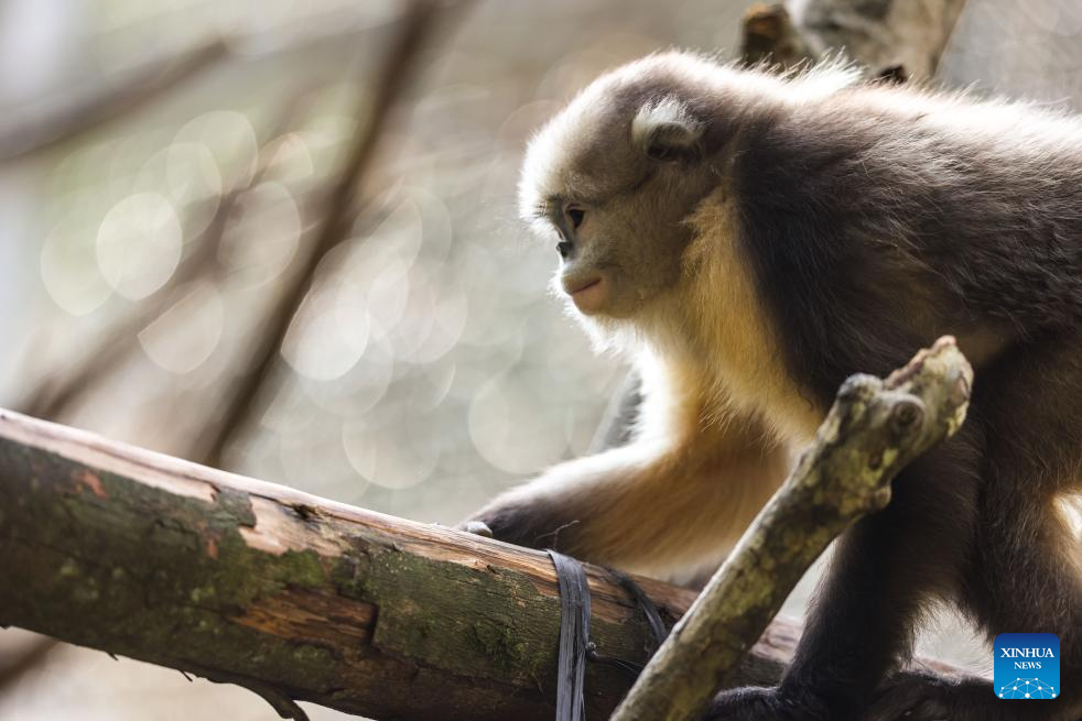 A Guizhou snub-nosed monkey is seen in a Guizhou snub-nosed monkey research center of Mount Fanjing National Nature Reserve in southwest China's Guizhou Province, April 15, 2025. (Xinhua/Ou Dongqu)