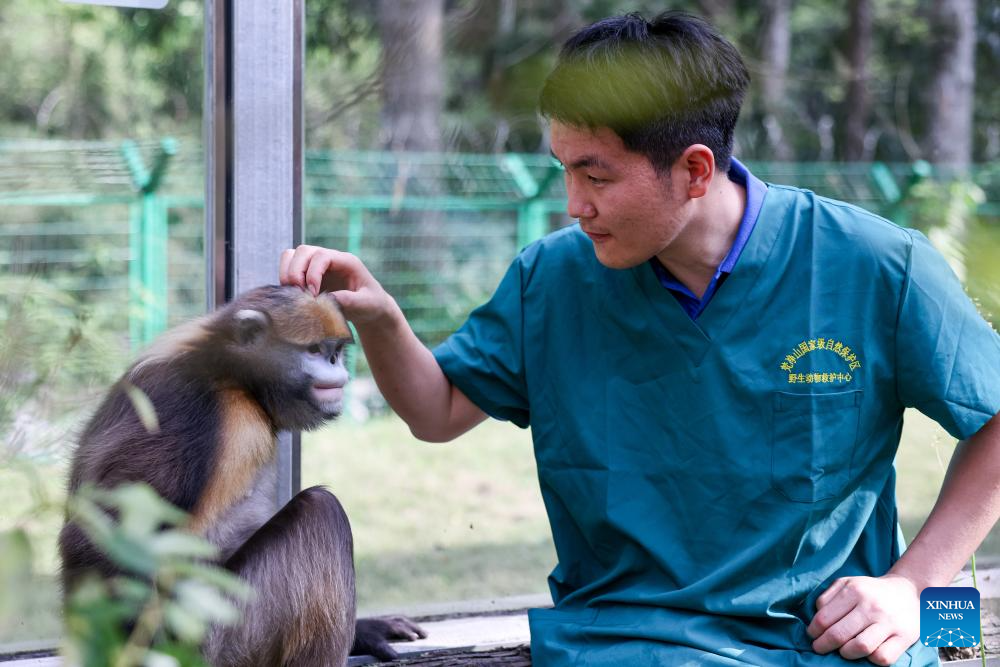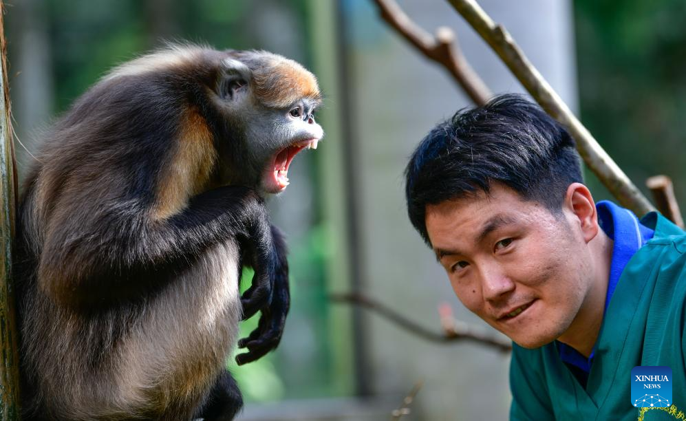 A keeper interacts with a Guizhou snub-nosed monkey in a Guizhou snub-nosed monkey research center of Mount Fanjing National Nature Reserve in southwest China's Guizhou Province, April 15, 2025. (Xinhua/Ou Dongqu)