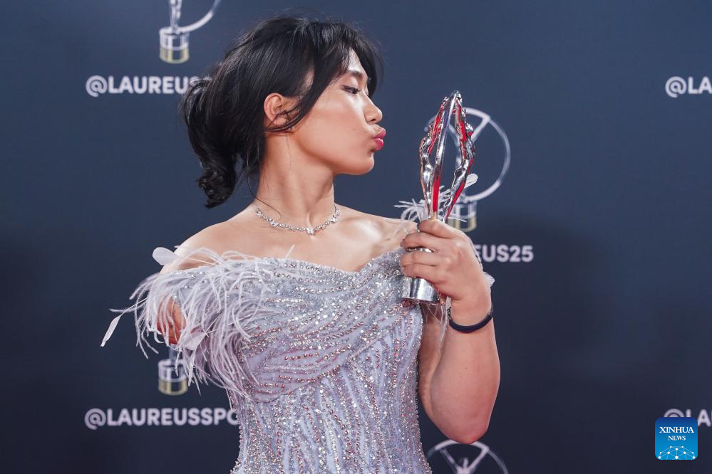 Chinese paralympic swimmer Jiang Yuyan poses with the Sportsperson of the Year with a Disability award trophy during the 26th Laureus World Sports Awards gala in Madrid, Spain, on April 21, 2025. (Xinhua/Peng Ziyang)