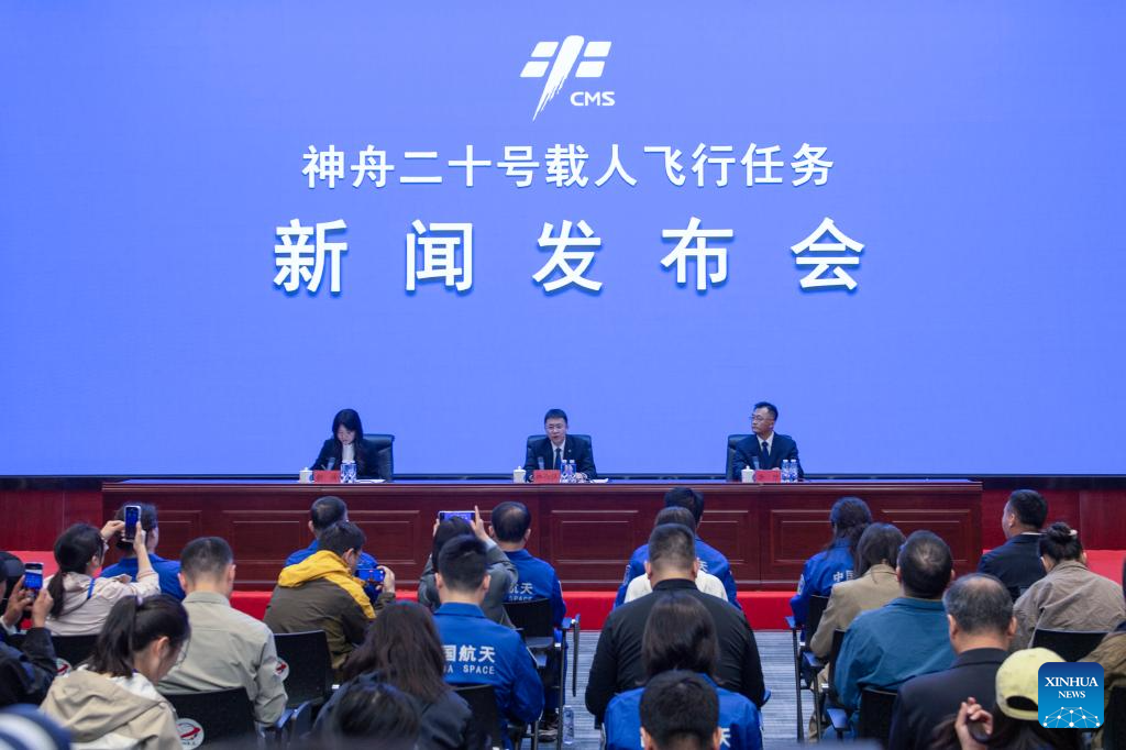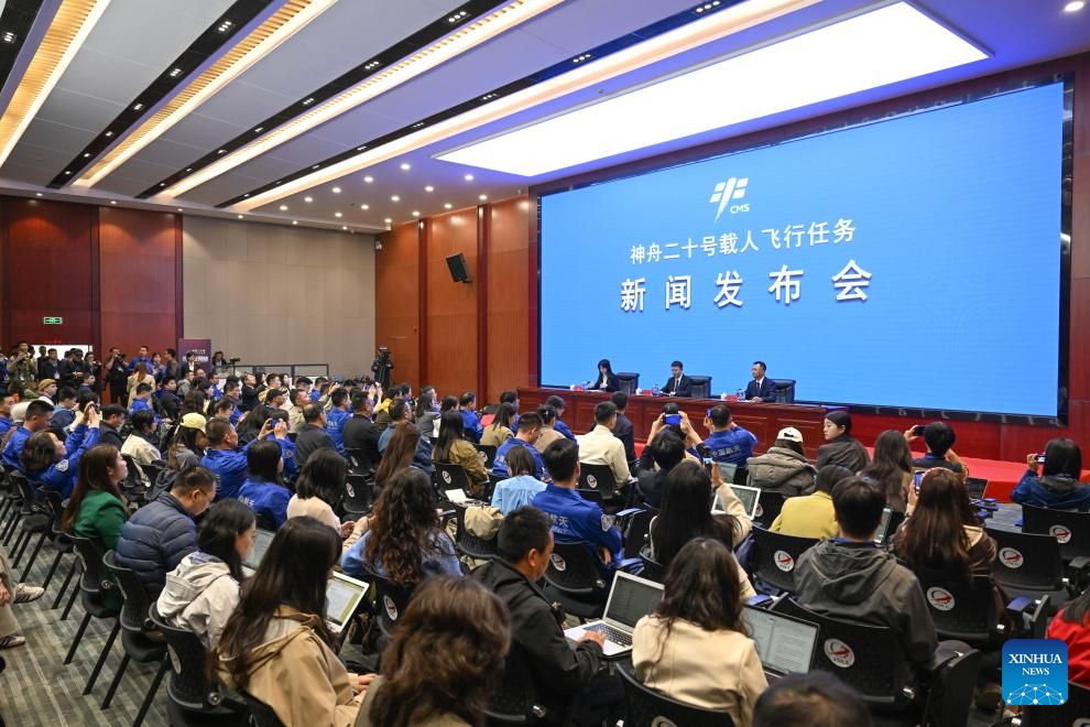 A press conference on the Shenzhou-20 crewed spaceflight mission is held in Jiuquan Satellite Launch Center in northwest China on April 23, 2025. (Xinhua/Ma Jinrui)