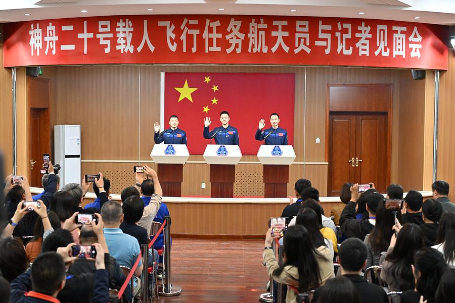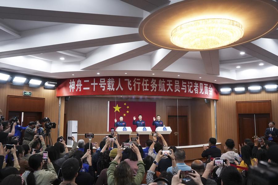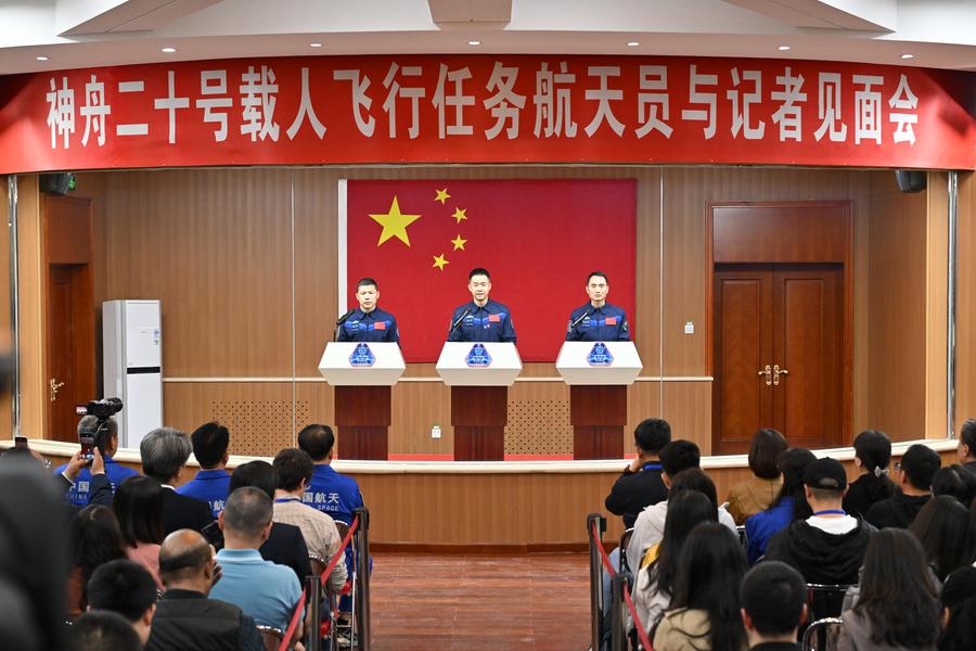 JIUQUAN, April 23 (Xinhua) -- Chen Dong, Chen Zhongrui and Wang Jie, the three Chinese astronauts for the upcoming Shenzhou-20 spaceflight mission, met the press on Wednesday.