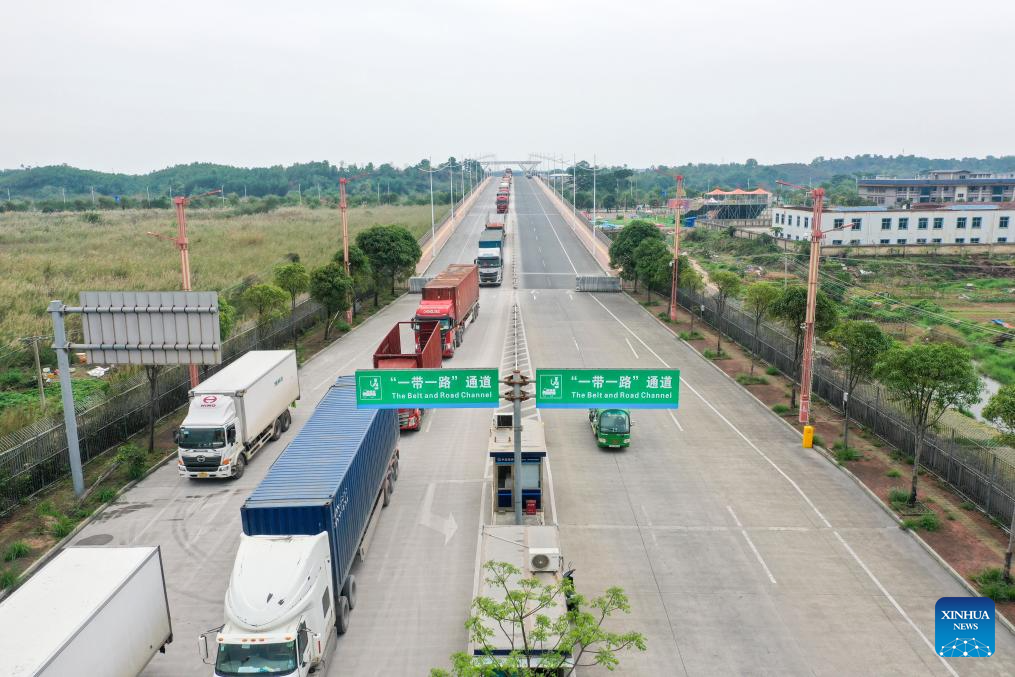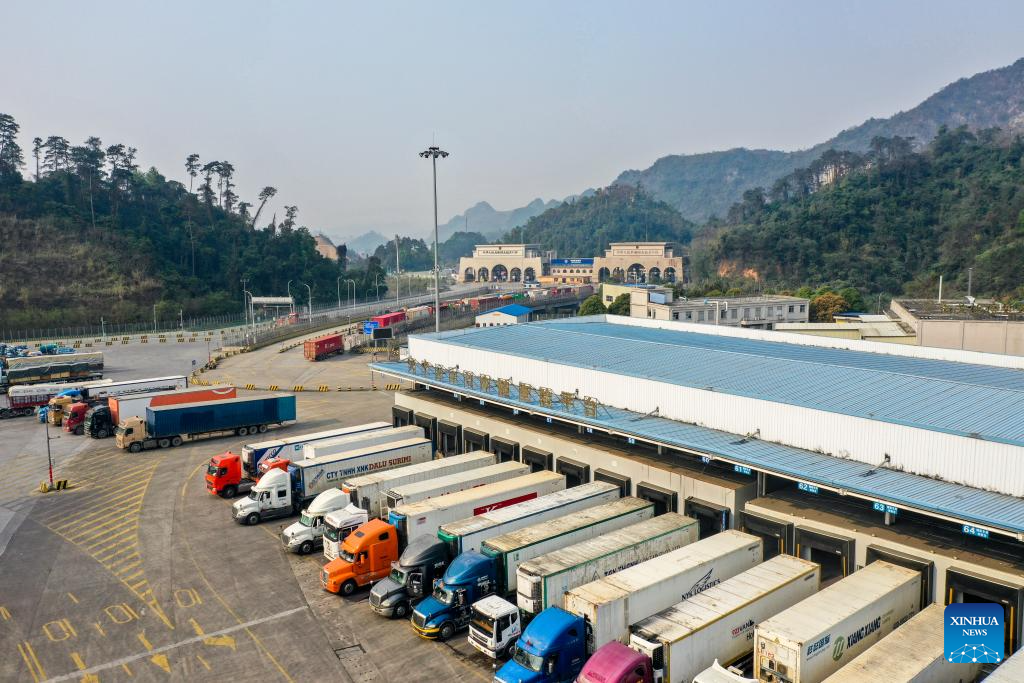 An aerial drone photo taken on March 21, 2025 shows trucks loaded with agricultural products from China and ASEAN countries at the port of the Friendship Pass in Pingxiang, south China's Guangxi Zhuang Autonomous Region. Over the years, along with the deepening of the Belt and Road Initiative (BRI) and the development of the New International Land-Sea Trade Corridor, export and import of agricultural products between China and Southeast Asia countries have been continuously strengthened. Agricultural products from both sides won great popularity among the buyers. (Xinhua/Cao Yiming)
