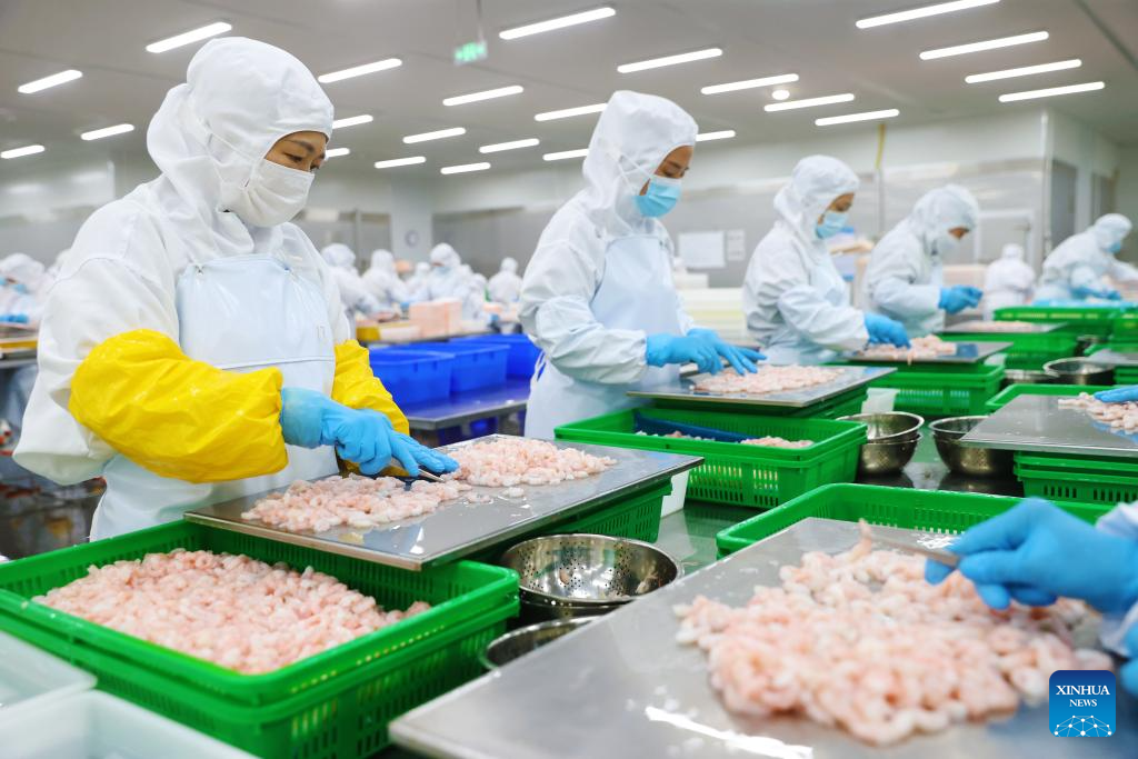 (250423) -- CHONGQING, April 23, 2025 (Xinhua) -- Staff members process imported shrimps at a food company in southwest China's Chongqing Municipality, April 19, 2025. Over the years, along with the deepening of the Belt and Road Initiative (BRI) and the development of the New International Land-Sea Trade Corridor, export and import of agricultural products between China and Southeast Asia countries have been continuously strengthened. Agricultural products from both sides won great popularity among the buyers. (Photo by Yang Min/Xinhua)