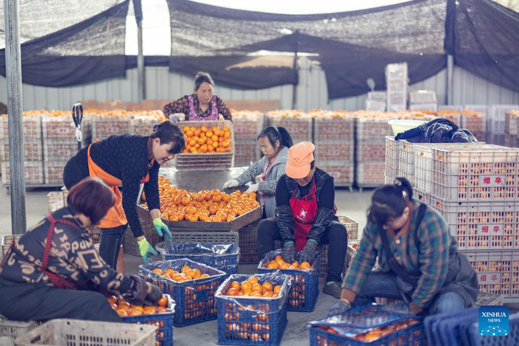 (250423) -- CHONGQING, April 23, 2025 (Xinhua) -- Villagers pack tangerines for export in Baohe Village of Changshou District, southwest China's Chongqing Municipality, March 24, 2025. Over the years, along with the deepening of the Belt and Road Initiative (BRI) and the development of the New International Land-Sea Trade Corridor, export and import of agricultural products between China and Southeast Asia countries have been continuously strengthened. Agricultural products from both sides won great popularity among the buyers. (Xinhua/Huang Wei)
